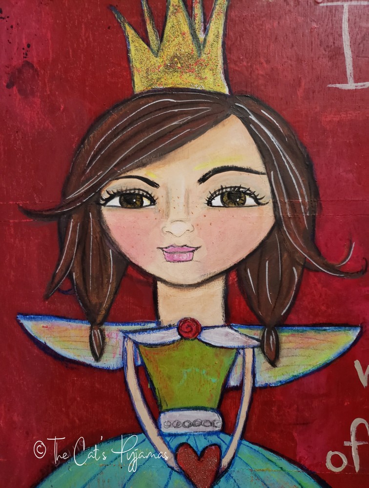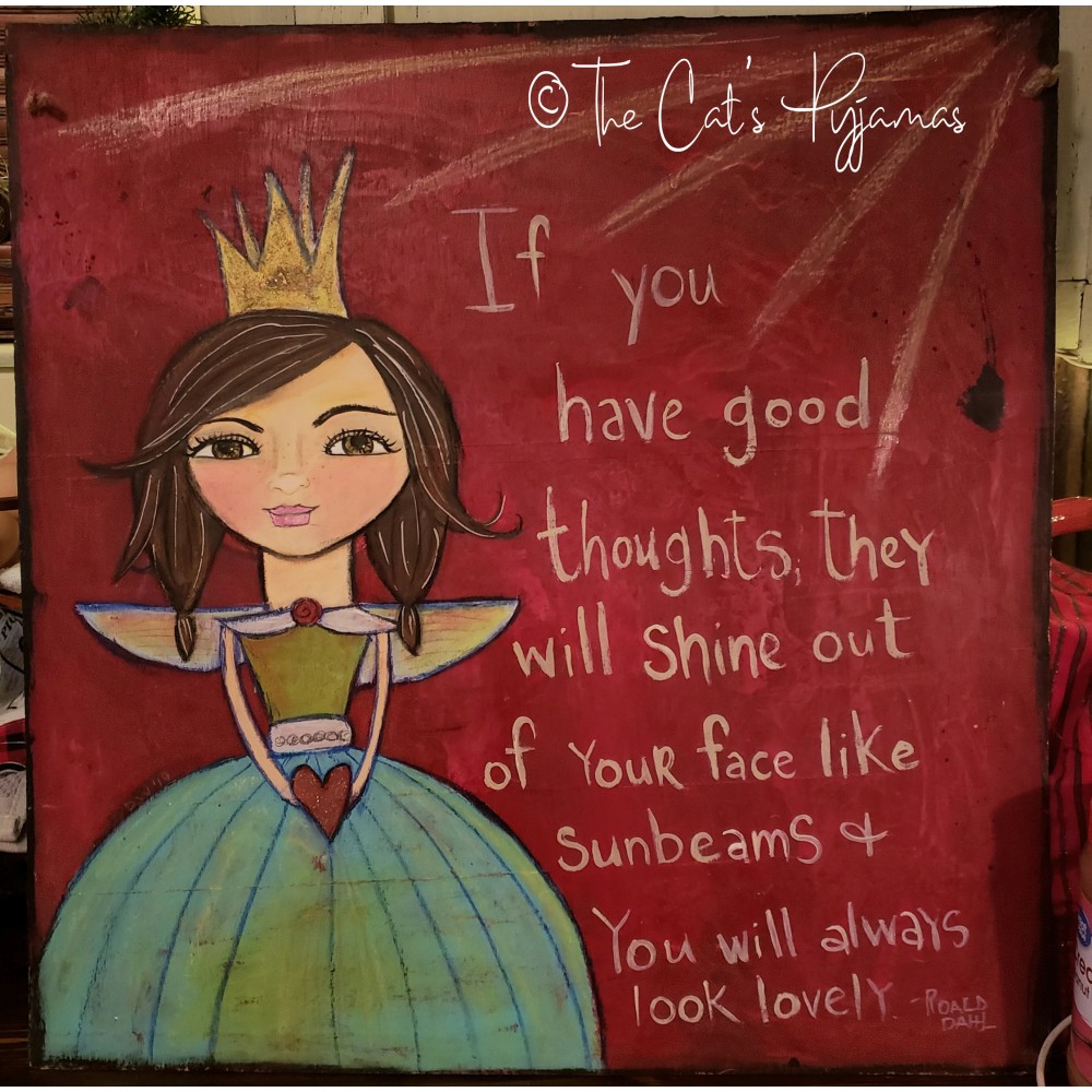 Mixed media painting using a combination of acrylics, oil pastels, watercolors, colored pencils, and glass glitter. Measures 22.5" x 22." Painted on a piece of upcycled plywood with a quote from Roald Dahl.