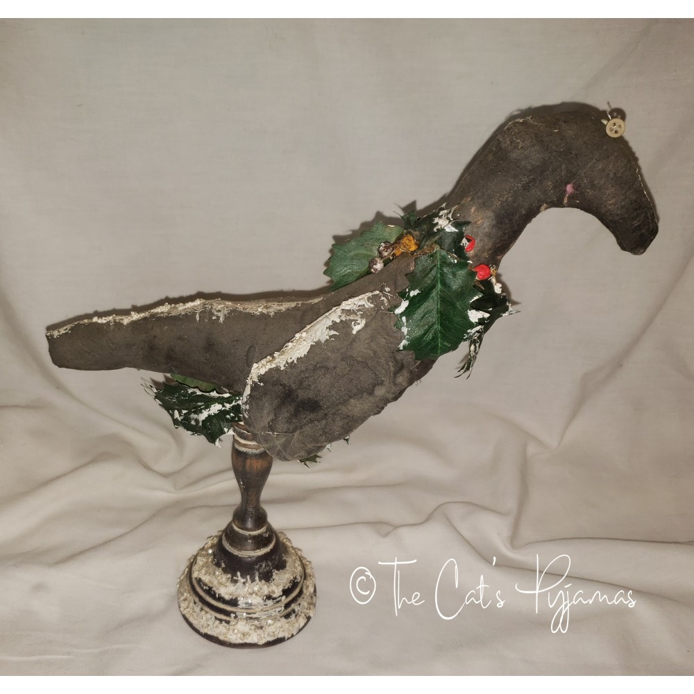 Painted fabric with faux snow, holly, old buttons for eyes and wooden base. A little over 13" tall.
