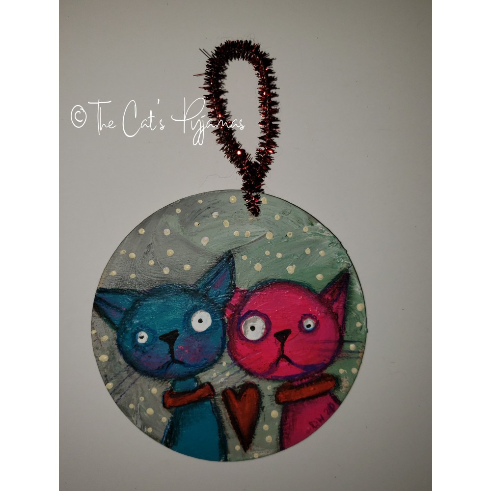 Measures just under 4" across, painted on a wooden ornament with a sparkly hanger