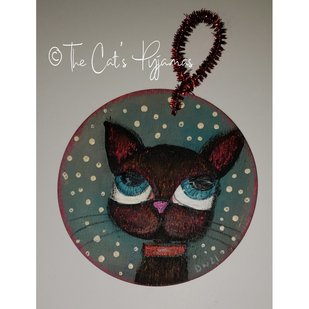 Measures just under 4" across, painted on a wooden ornament with a sparkly hanger