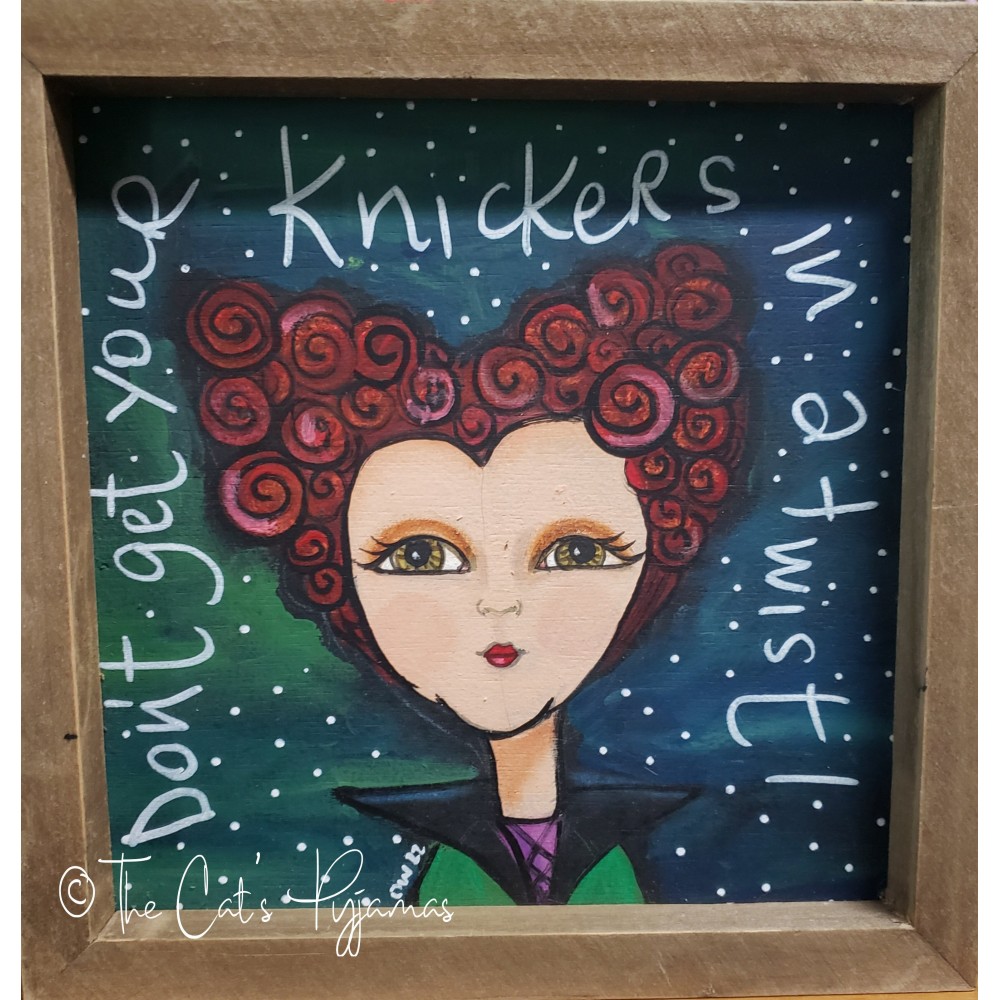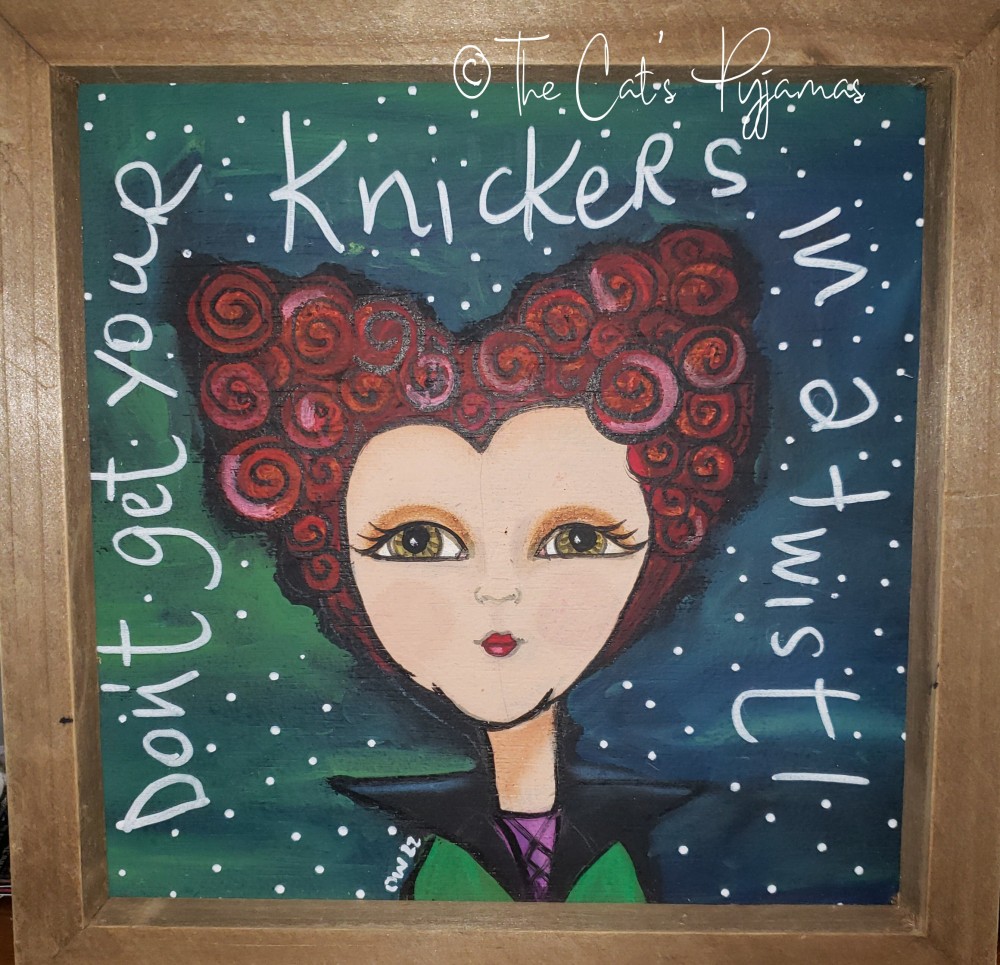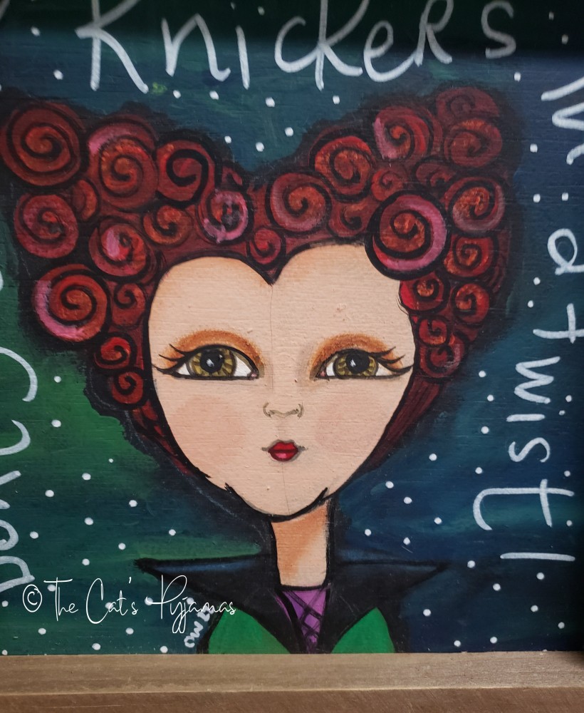 Mixed media painting of my version of Winnie Sanderson with a quote from the movie, "Don't get your knickers in a twist!"