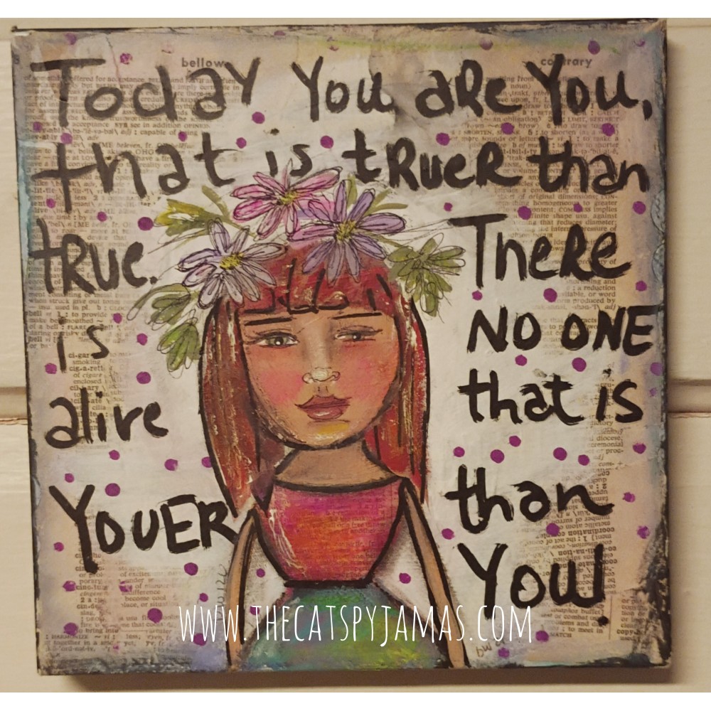 I love the contrast of neon colors on this old encyclopedia page. This is a canvas (kind of a thick paper type, not regular canvas) that I covered over with book pages. I painted the sides black land made the black border the edges with a grungy kind of look. The princes has choppy brown hair and big brown eyes. You can see some of the words through her hair, wings and neon purple dress. Measures just under 8" square. I have another one on my site that looks great with it that's the same size and background.