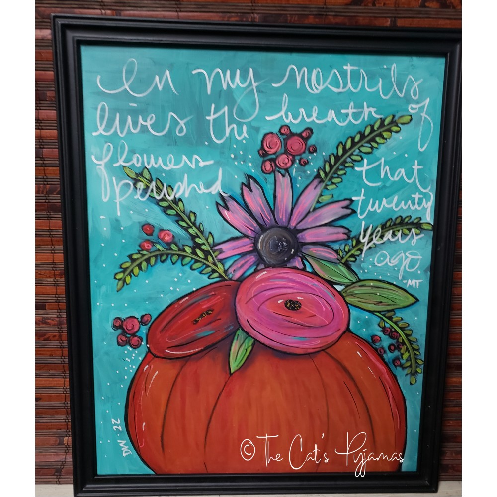 Mixed media art painted of a fall floral arrangement. I used a combination of acrylics, watercolors, oil pastels, etc. Frame measures 17.5" x 2".