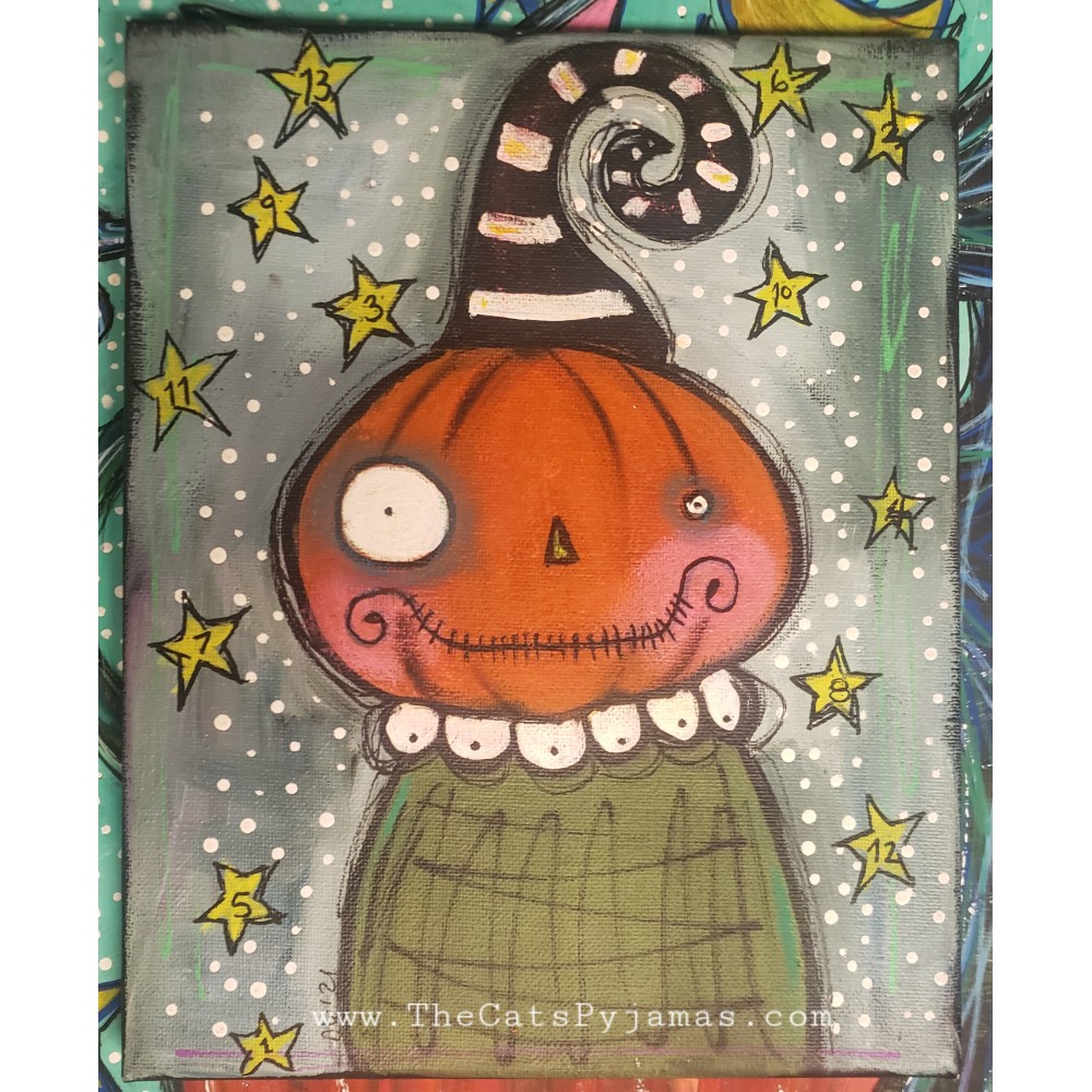 Mixed media painting of a pumpkinhead in a funky striped hat. Painted on an 8x10" stretched canvas using a combination of acrylics, oil pastels, charcoal, colored pencils, and watercolors.