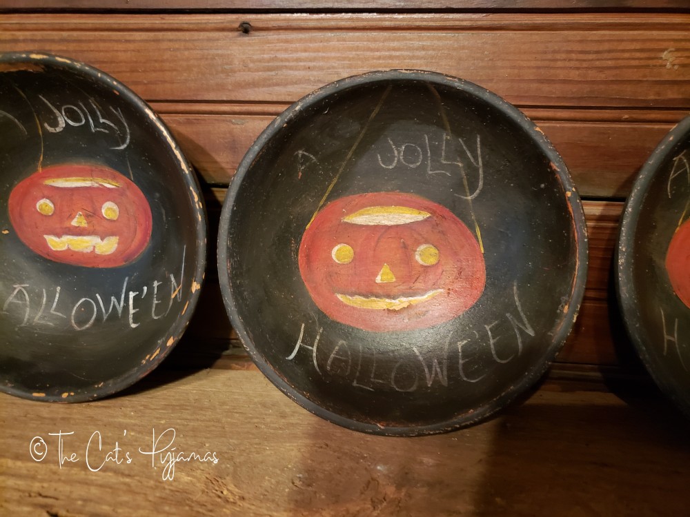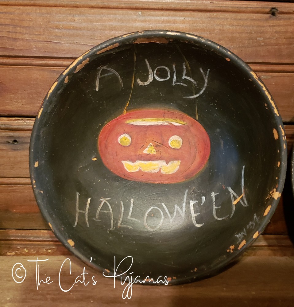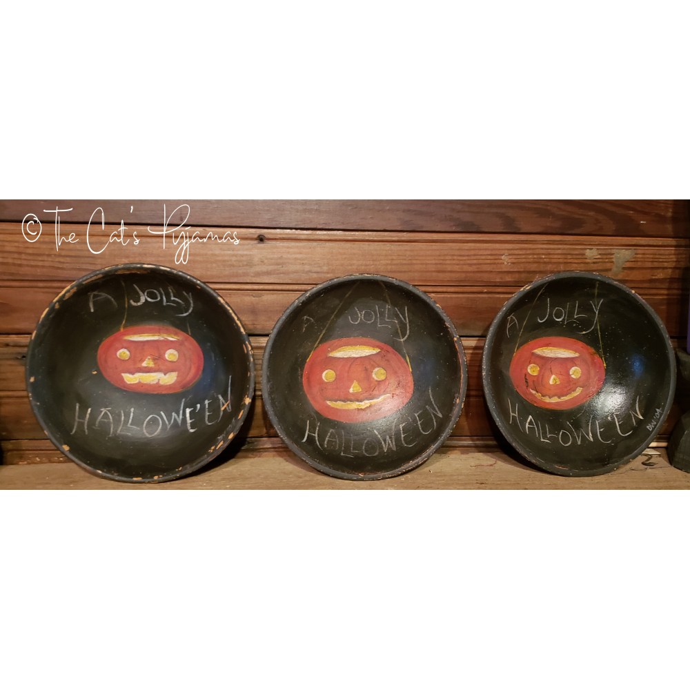 Vintage wooden bowls, hand-painted & distressed for Halloween. These are based on a vintage Halloween postcard. Each bowl is 6" across. Buy one or all 3!