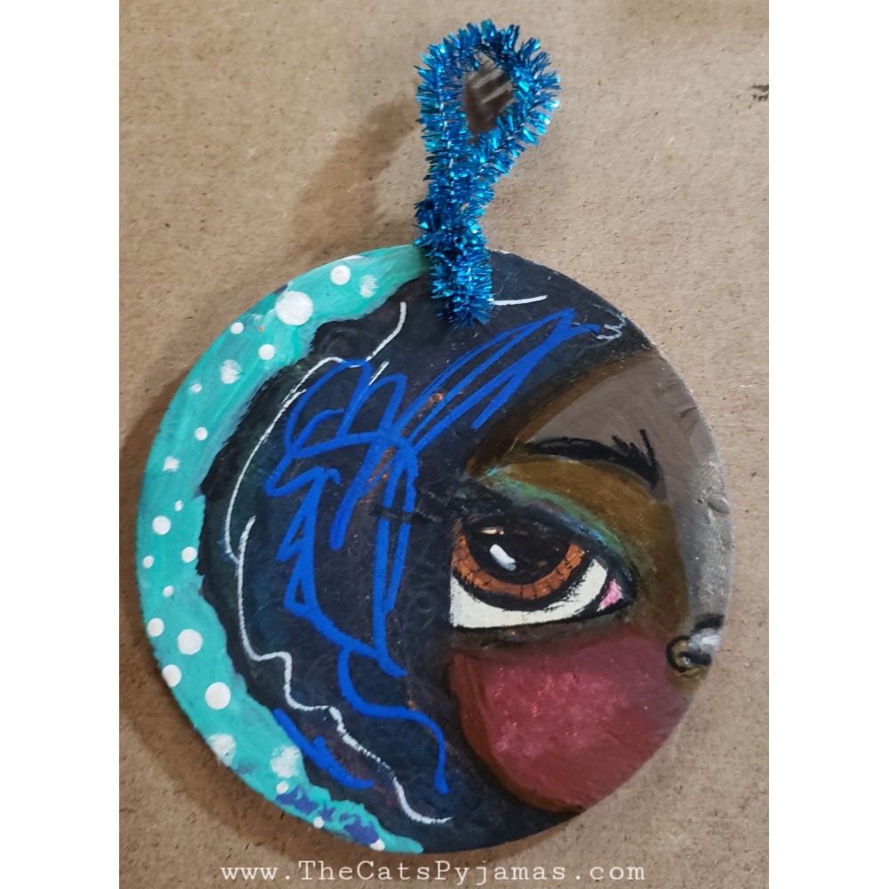 Measures a little over 3" across, painted on a wooden ornament with a sparkly hanger