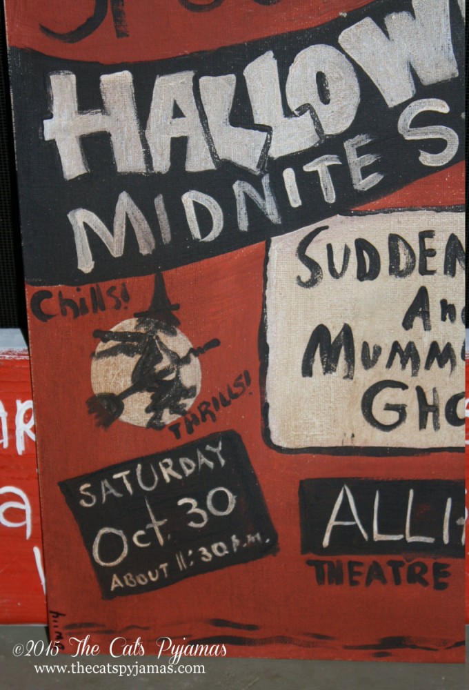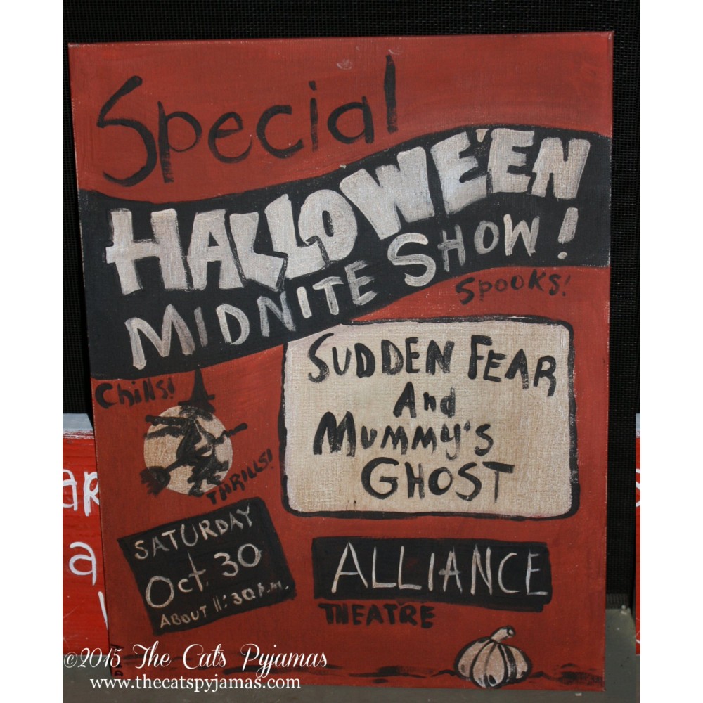 This is my version of an old Spook Show poster! I painted it on a 14" x 11" canvas panel in black, orange and white only. All hand-painted, no stencils used. It has been distressed and antiqued for an even more vintage look. Great to add to your Halloween decor or haunted house! Signed & dated.