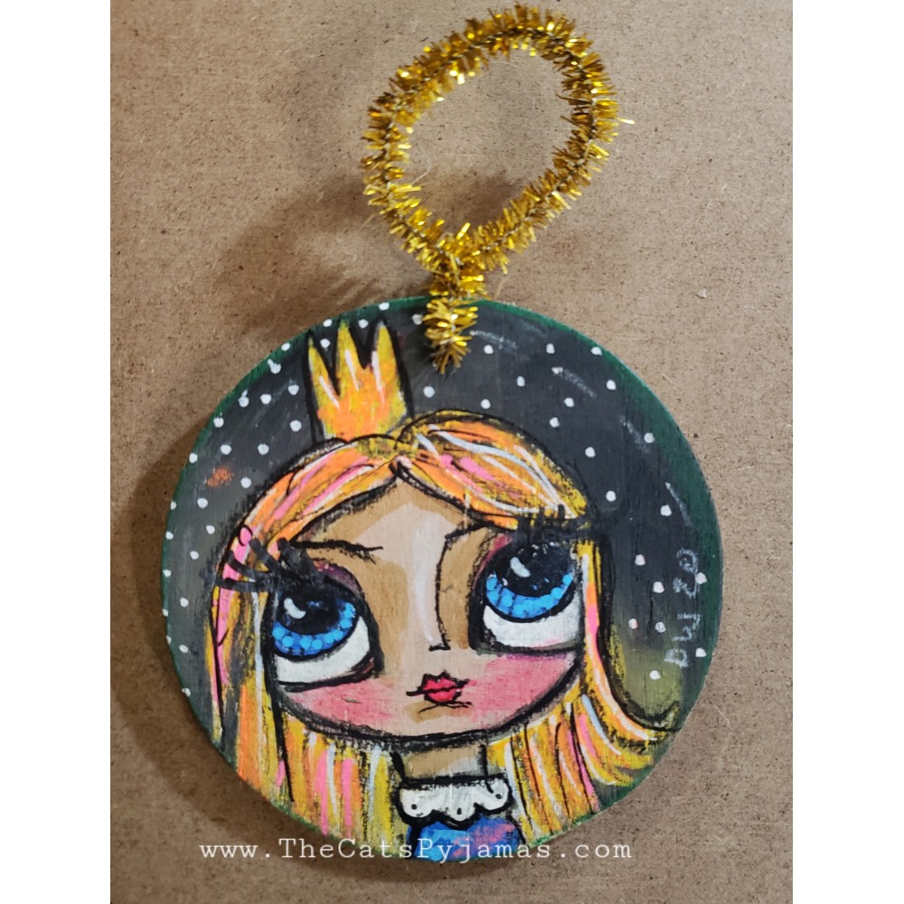 Measures 3.25" across, painted on a wooden ornament with a sparkly hanger