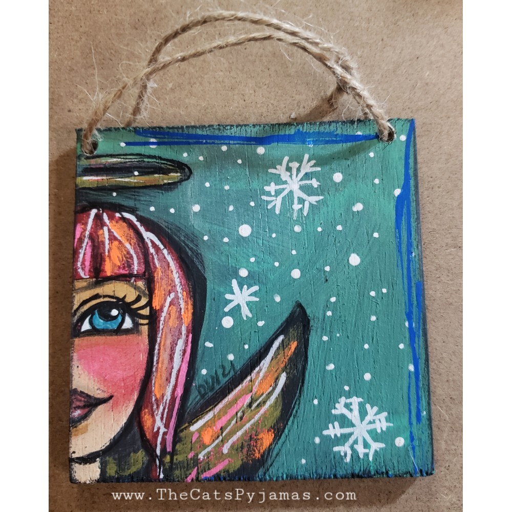Hand-painted ornament painted on a piece of reclaimed wood. I used a combination of acrylics, watercolors, oil pastels, etc. to paint this little folk-art angel.