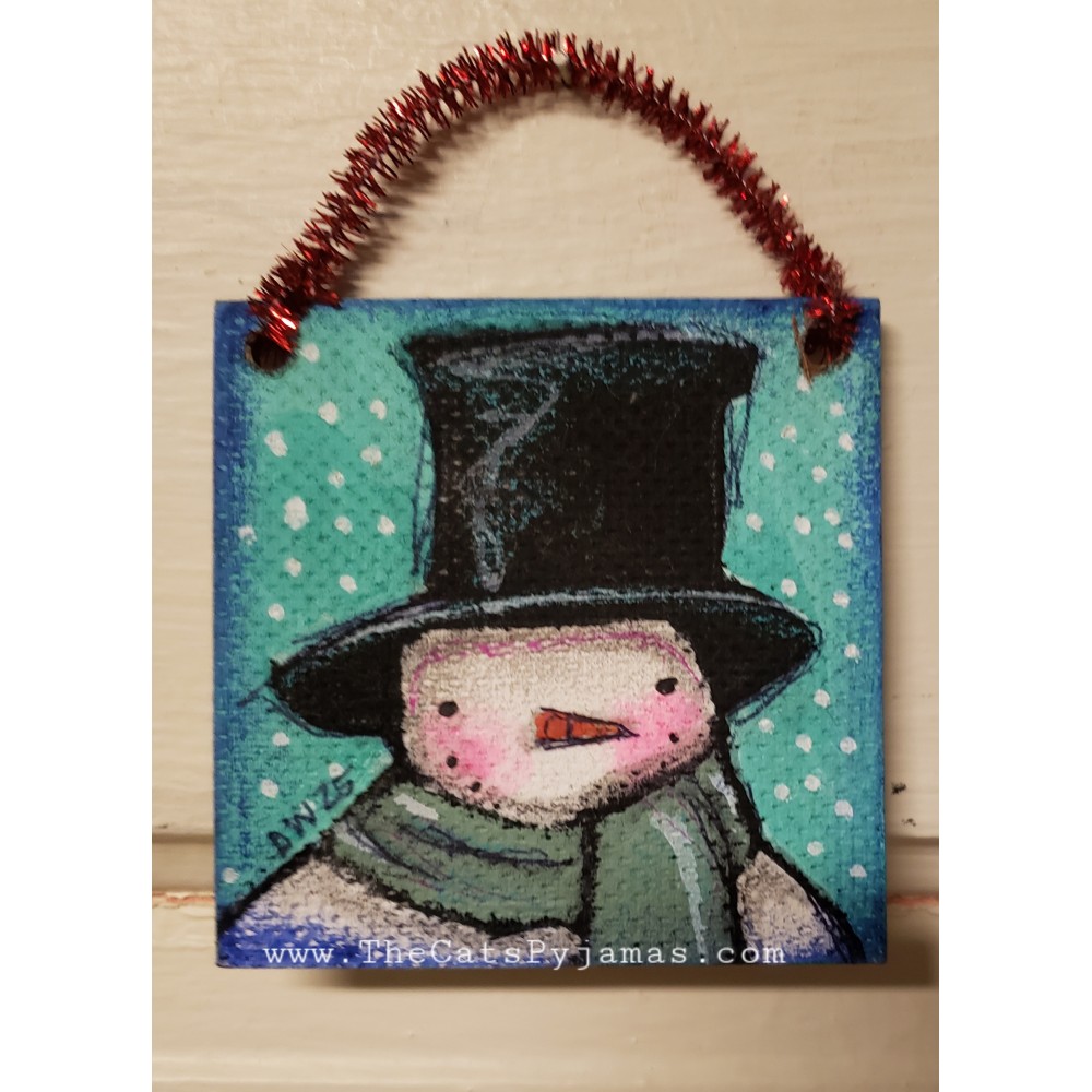 Hand-painted ornament painted on a piece of reclaimed wood. I used a combination of acrylics, watercolors, oil pastels, etc. to paint this snowman ornament.