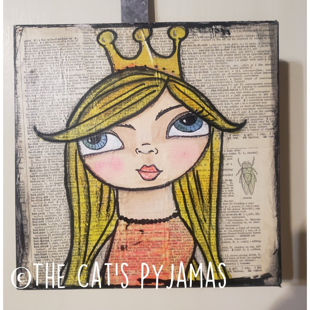 I love the contrast of neon colors on this old encyclopedia page. This is a canvas (kind of a thick paper type, not regular canvas) that I covered over with book pages. I painted the sides black land made the black border the edges with a grungy kind of look. The princes has bright yellow (I mean blonde!) hair and big blue eyes. You can see some of the words through her hair and neon pink dress. Measures just under 8" square. I have another one on my site that looks great with it that's the same size and background.