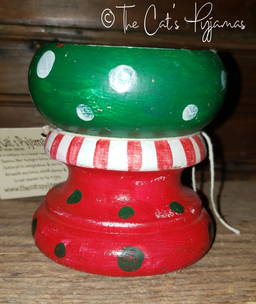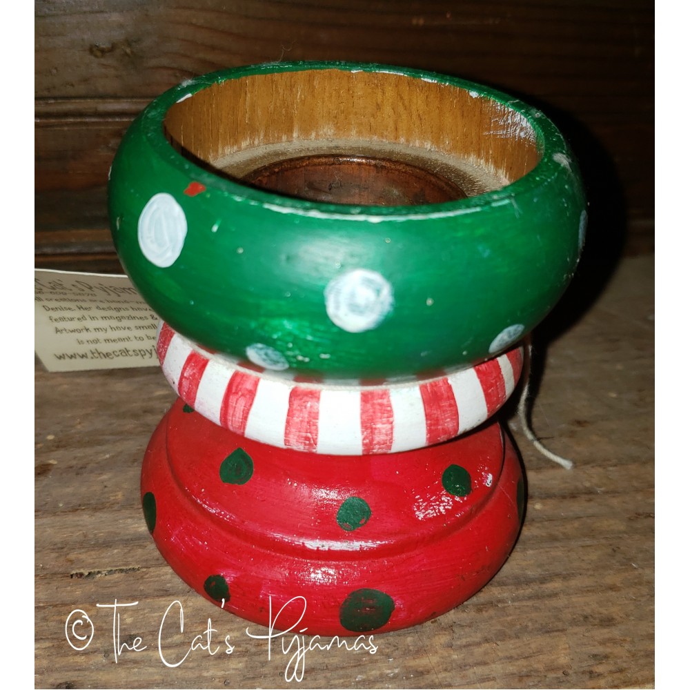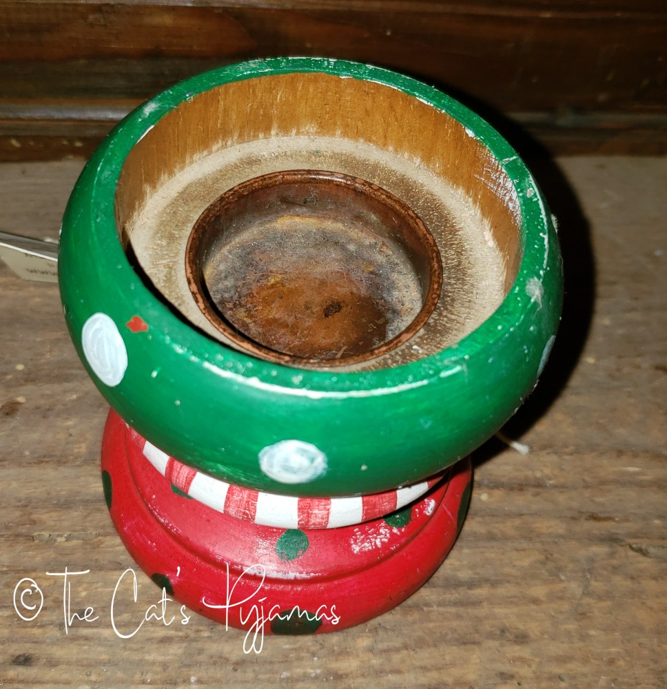 Vintage hand-painted wooden candleholder. Holds a pillar candle or a smaller votive candle.