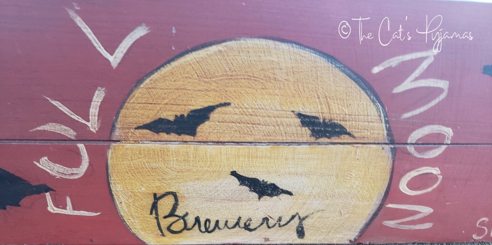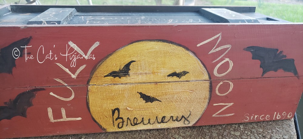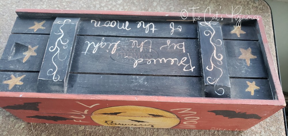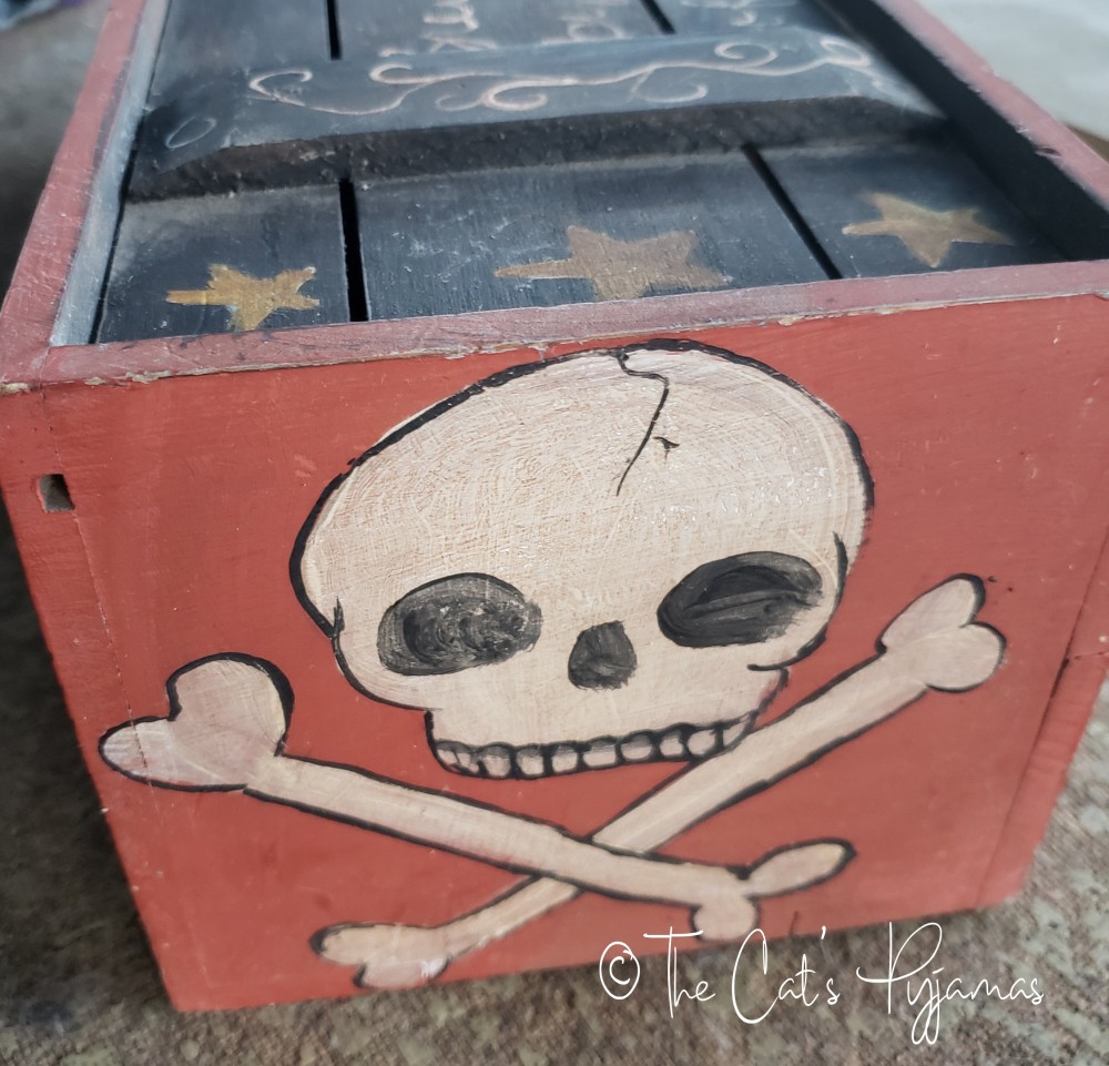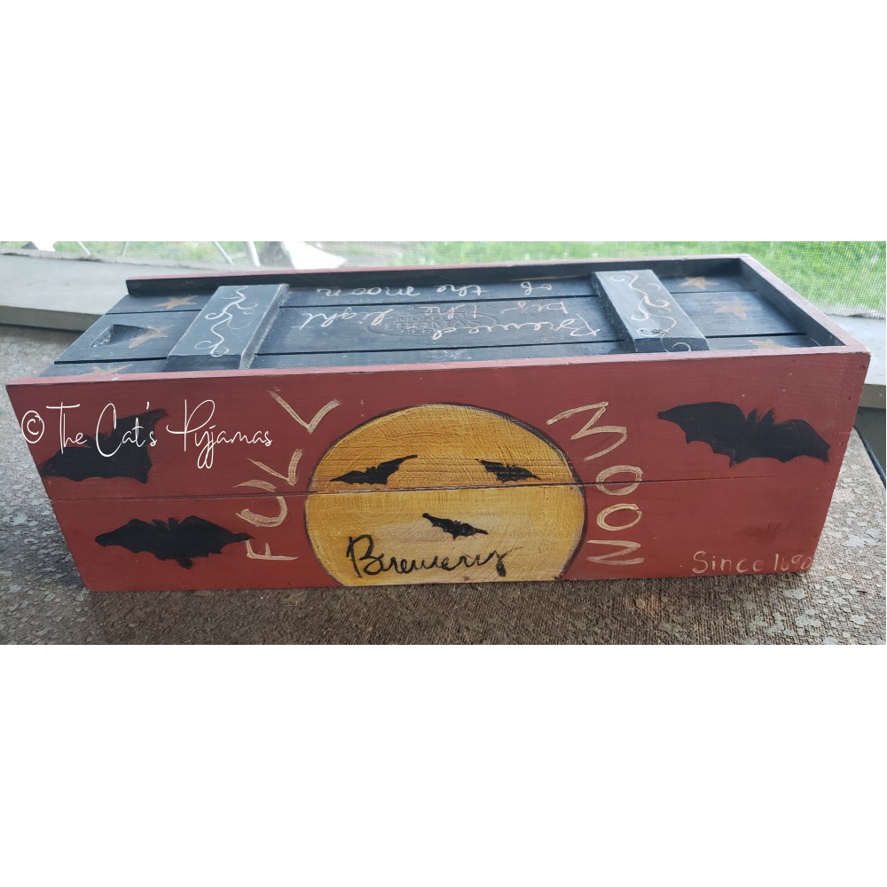 Wooden wine box turned into a Halloween storage box! It measures 15.5" long x 5" tall x 6" wide with a door that slides open.