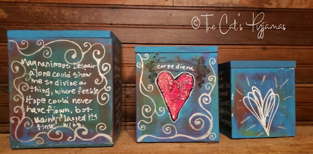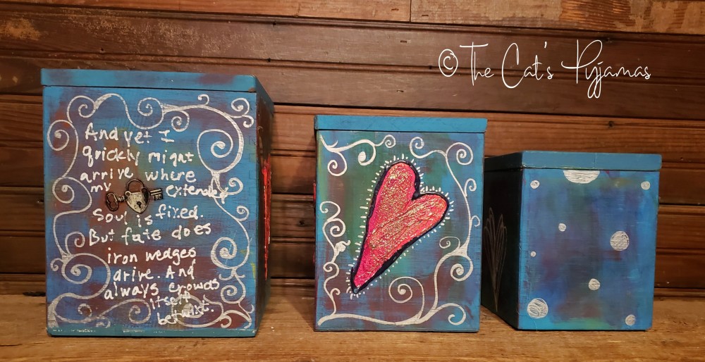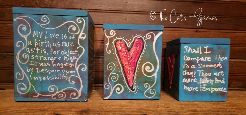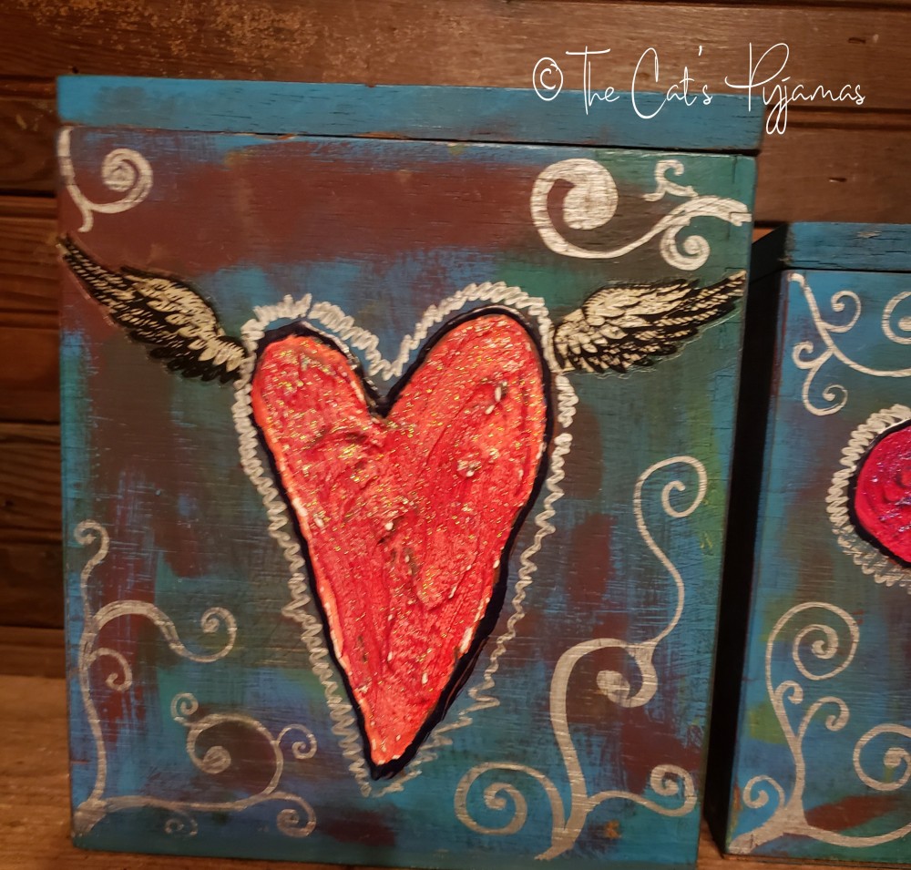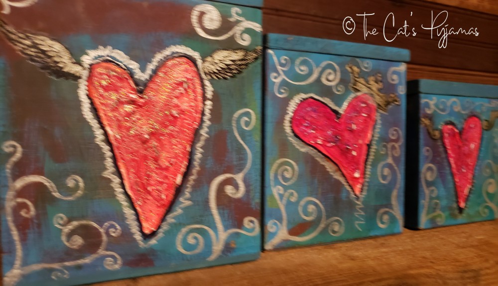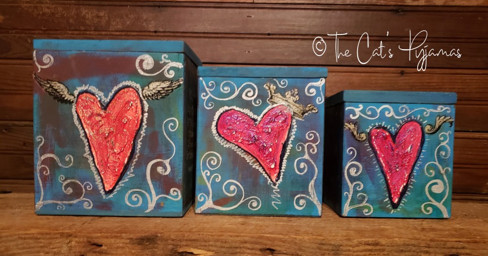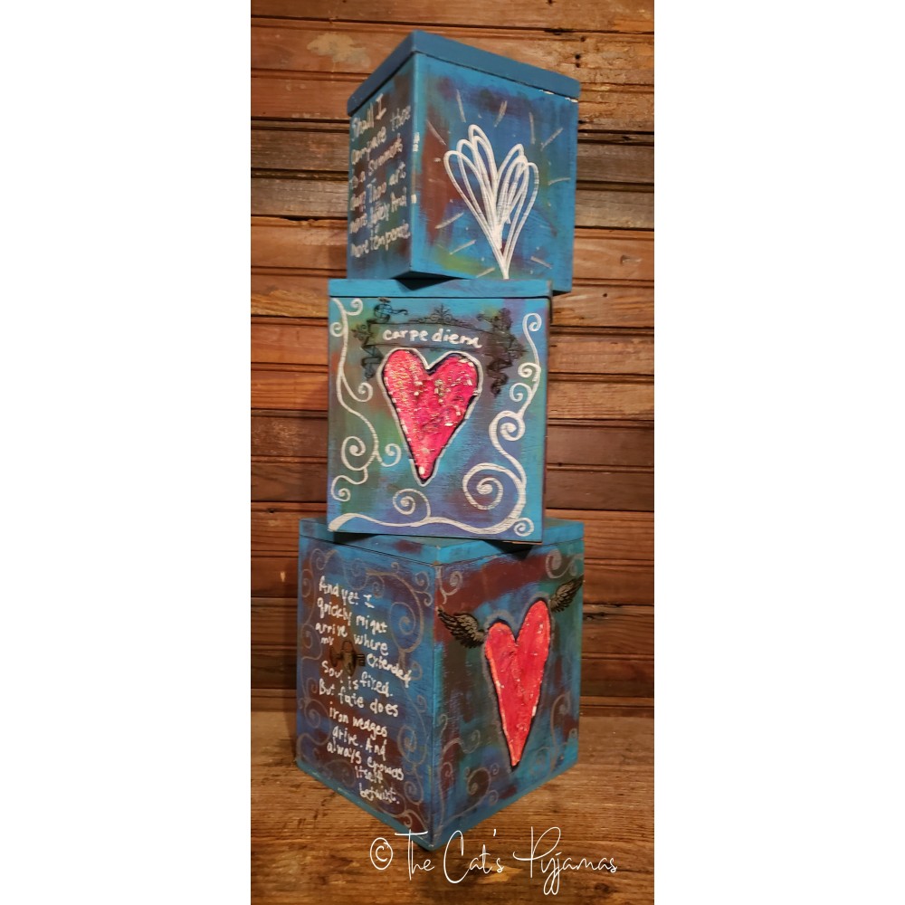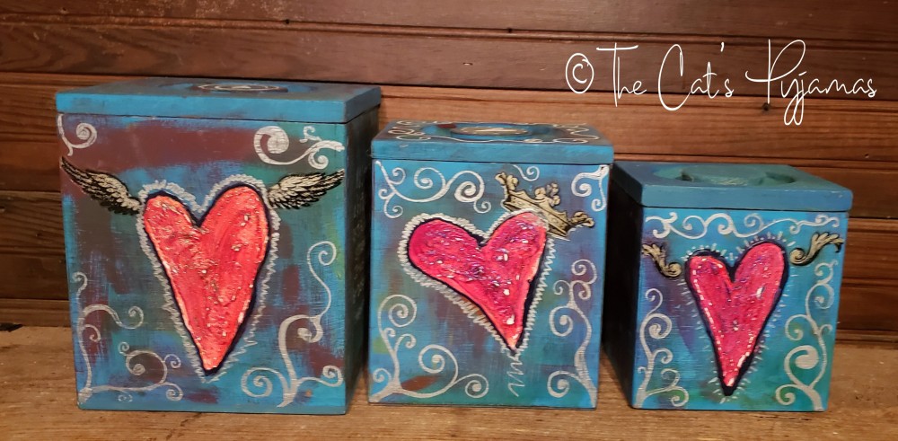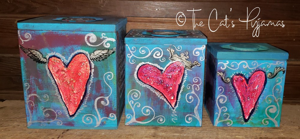 Set of three vintage wooden canisters. I painted them with acrylics in blues, teals and purples with silver and red accents. The hearts are textured and painted bright red. Each side of each canister is painted, some with hearts, some with white lettering. You can buy an individual canister or the whole set.