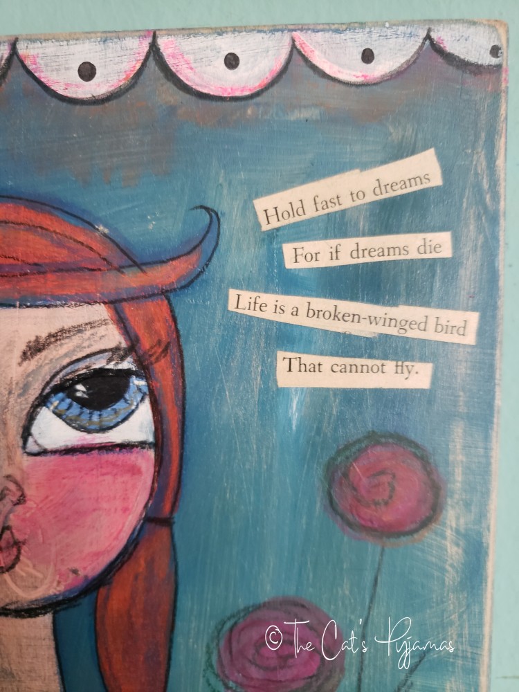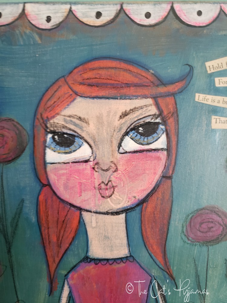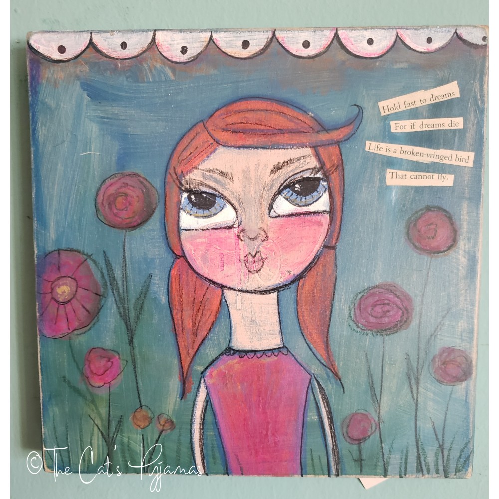Painted on a wooden canvas with a combination of acrylics, vintage book pages, oil pastels, watercolors, colored pencils, and ink. Measures 8" x 8".