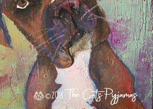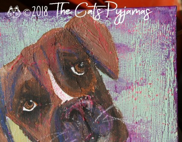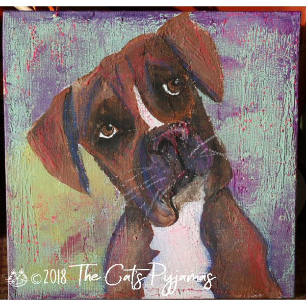 Cute little boxer painted on a flat canvas with a hanger on back. I used a combination or acrylic paints, watercolors, oil pastels and colored pencil and I used lots of bright colors.