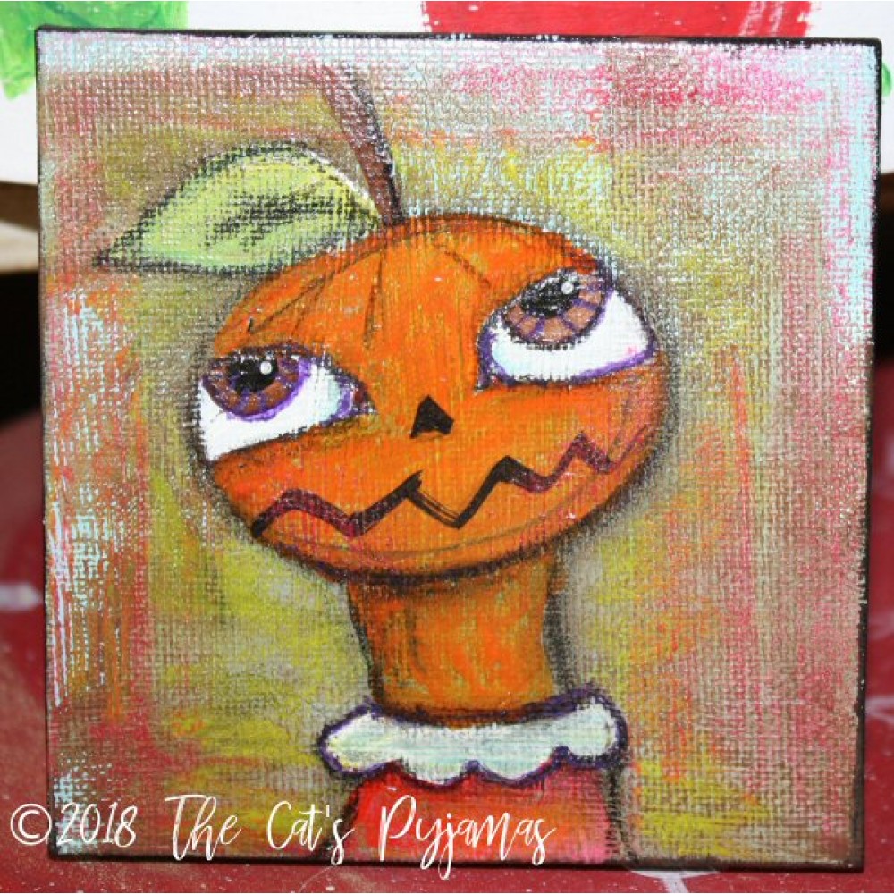 Lulla, the pumpkinhead is painted on a mini canvas. She has big brown eyes and a pretty red dress, just in time for the fall season! She's painted on a wrapped canvas with an abstract background. I used a combination or acrylic paints, watercolors, oil pastels and colored pencil and I used lots of bright colors.