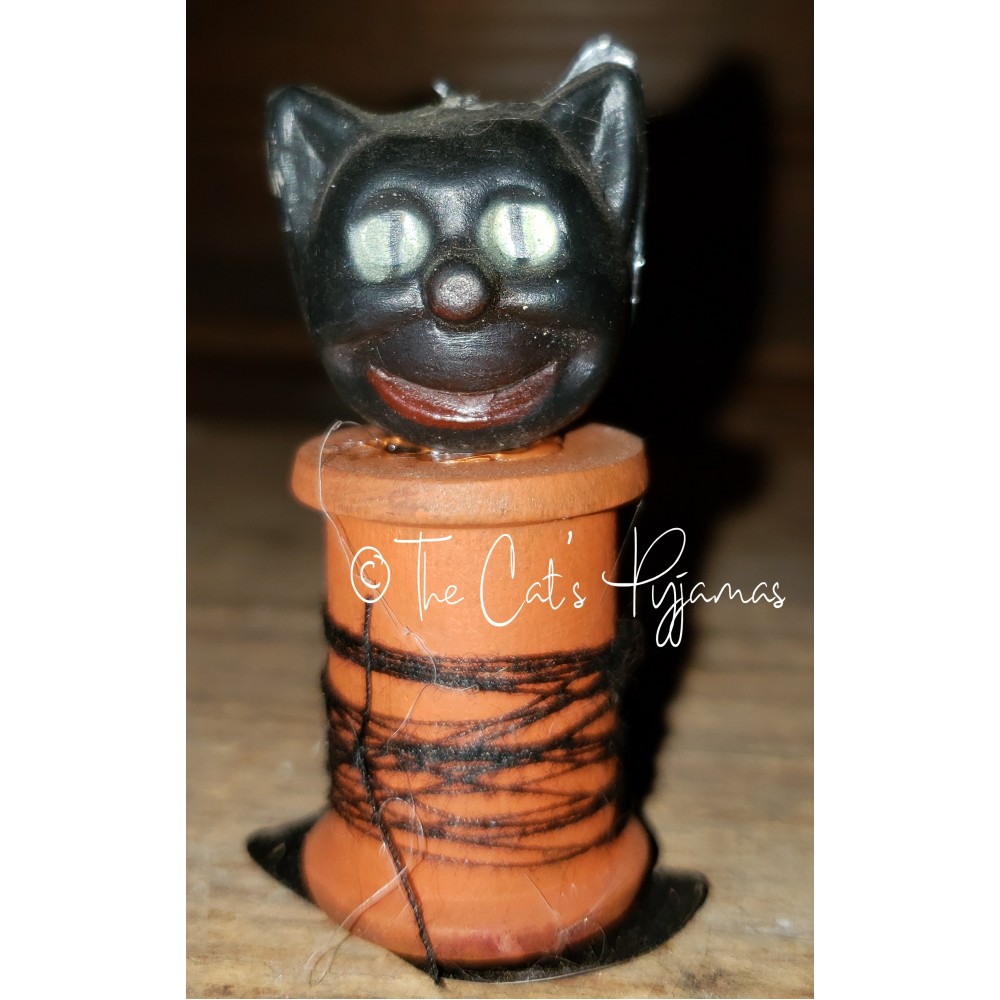 Assemblage made from a painted thread spool, black thread, and a vintage black cat cupcake pick. Measures about 2" tall.