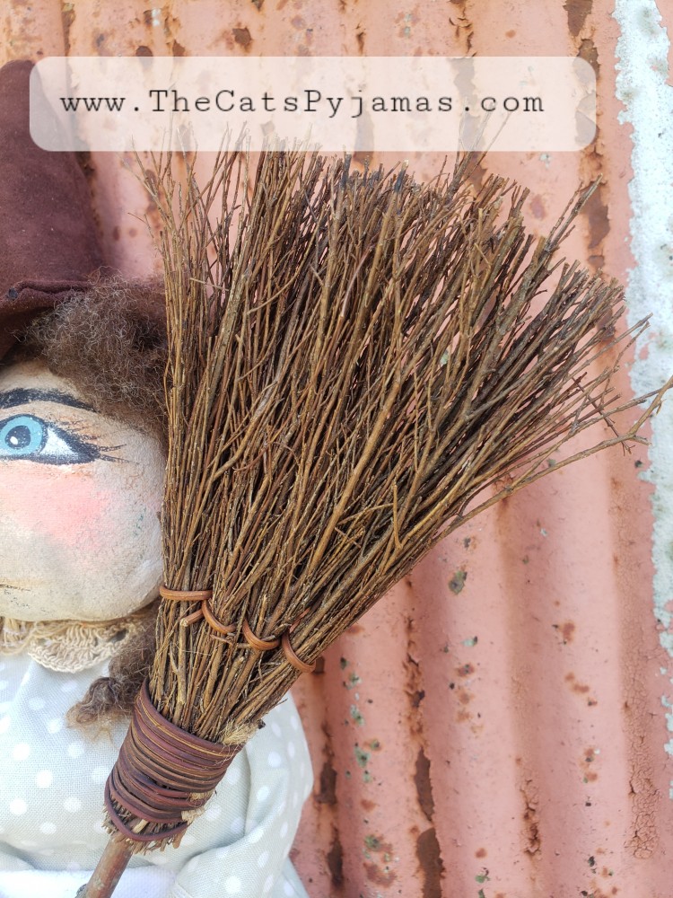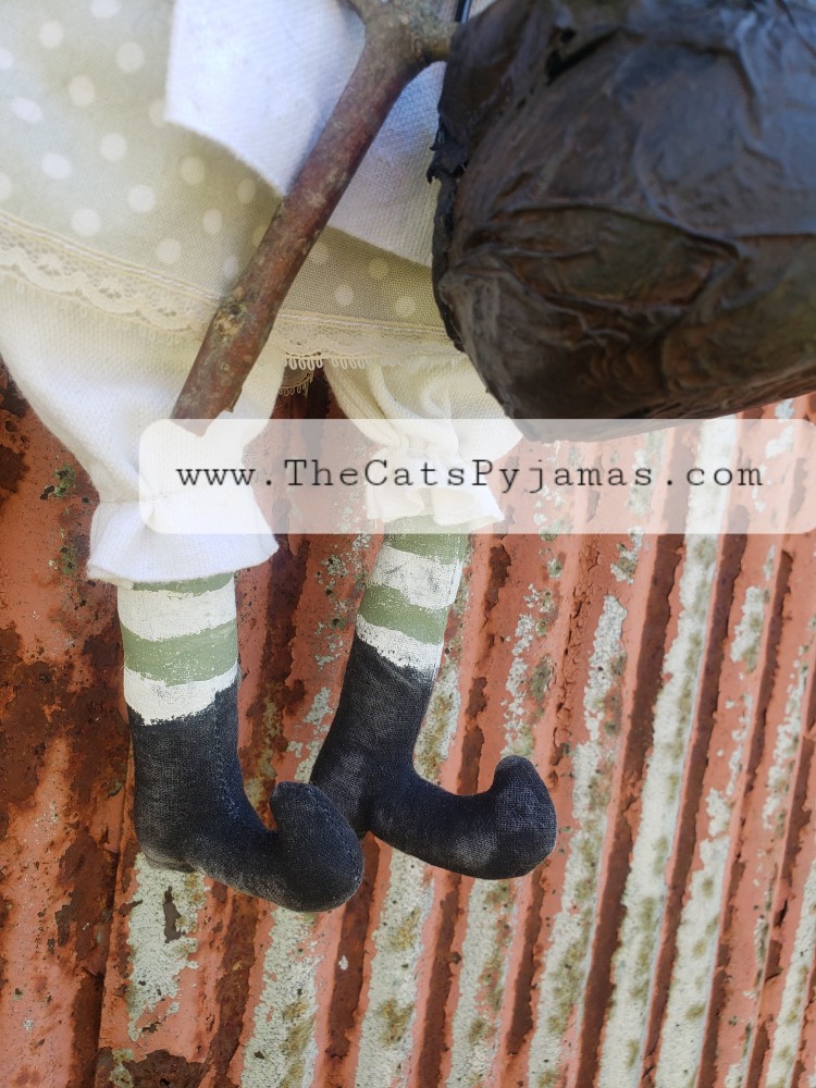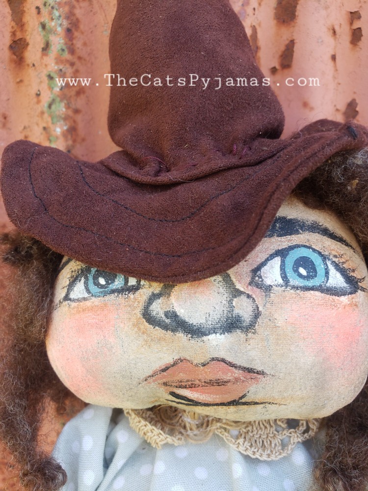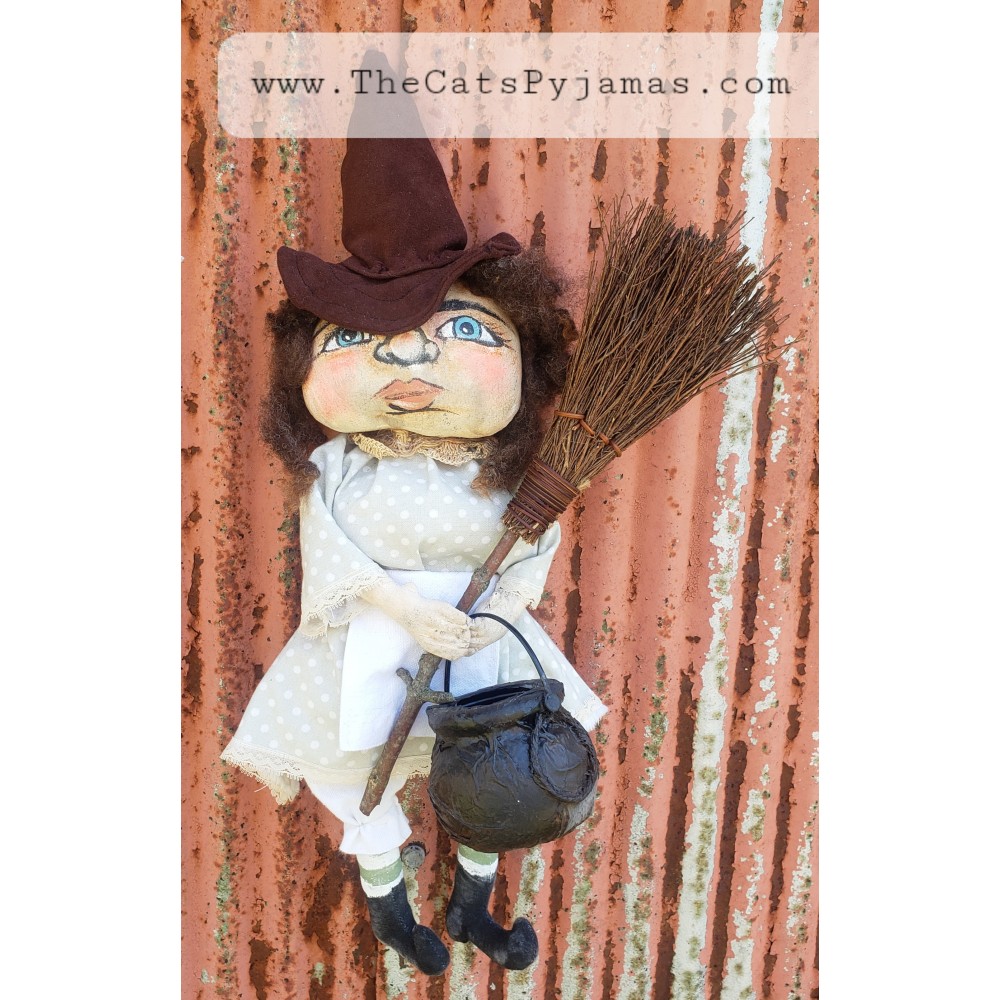 Althea is made from painted fabric with wool hair, a rustic broom, and little cauldron