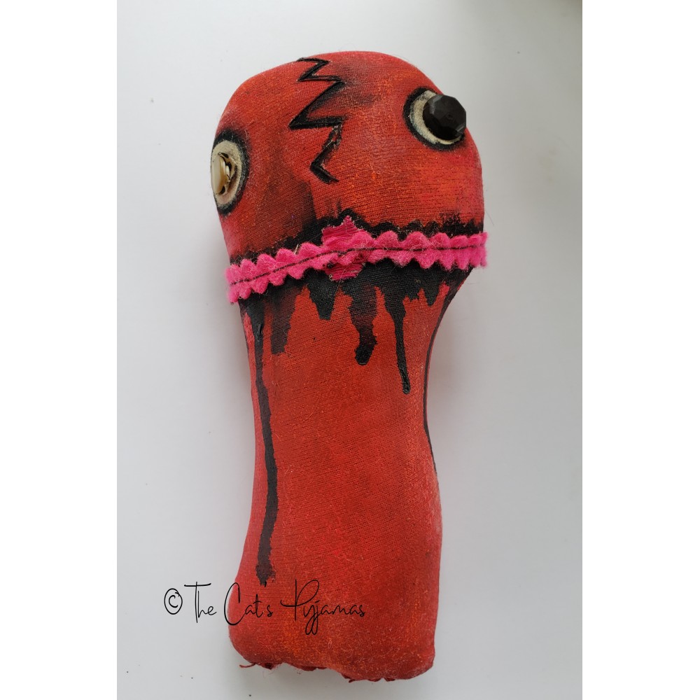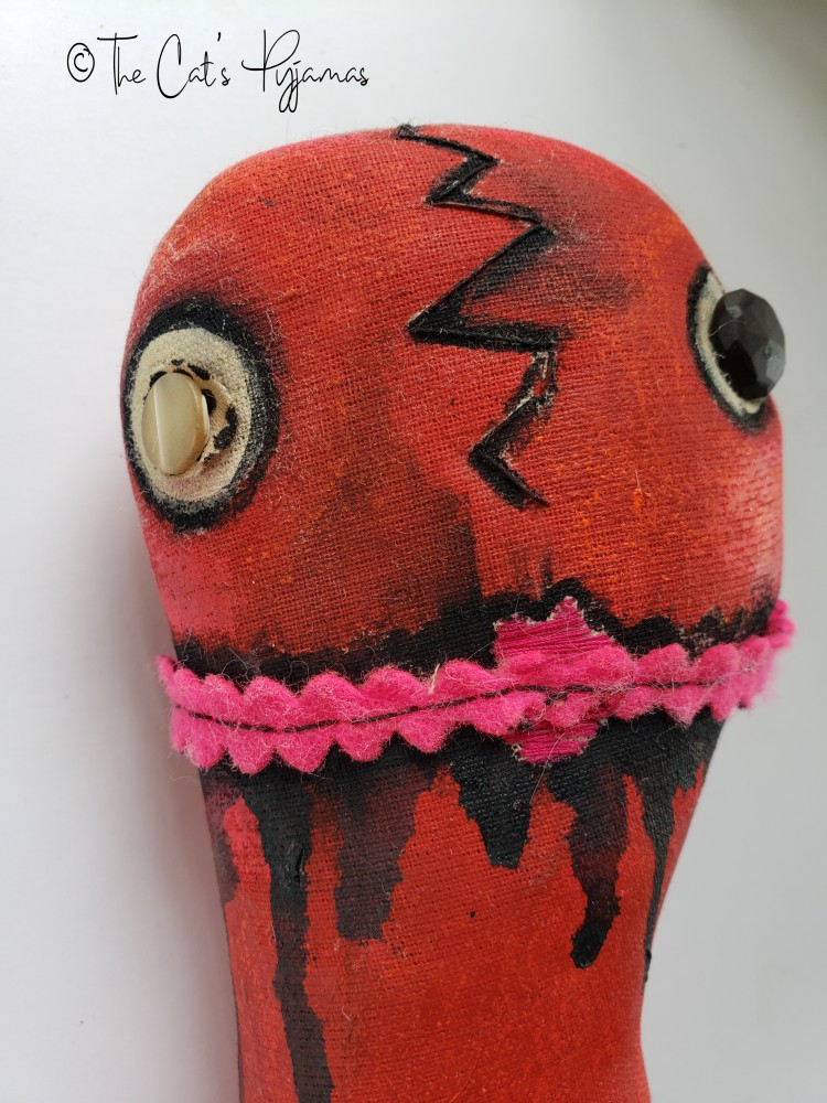 Made of painted fabric with a stitched nose, neon pink rick rack for a mouth, and mismatched button eyes. He measures just under 7" tall.