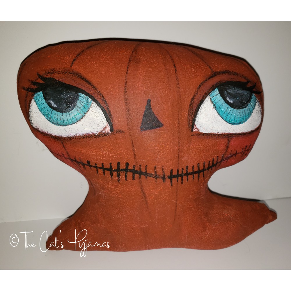 Jack-o-lantern made of painted fabric. His face is painted using a combination of acrylic paint, oil pastels, watercolors, and colored pencil. He's about 7" tall with a hanger on the back. He'd look awesome hanging on your front door as a part of a wreath or added to a fall grouping.