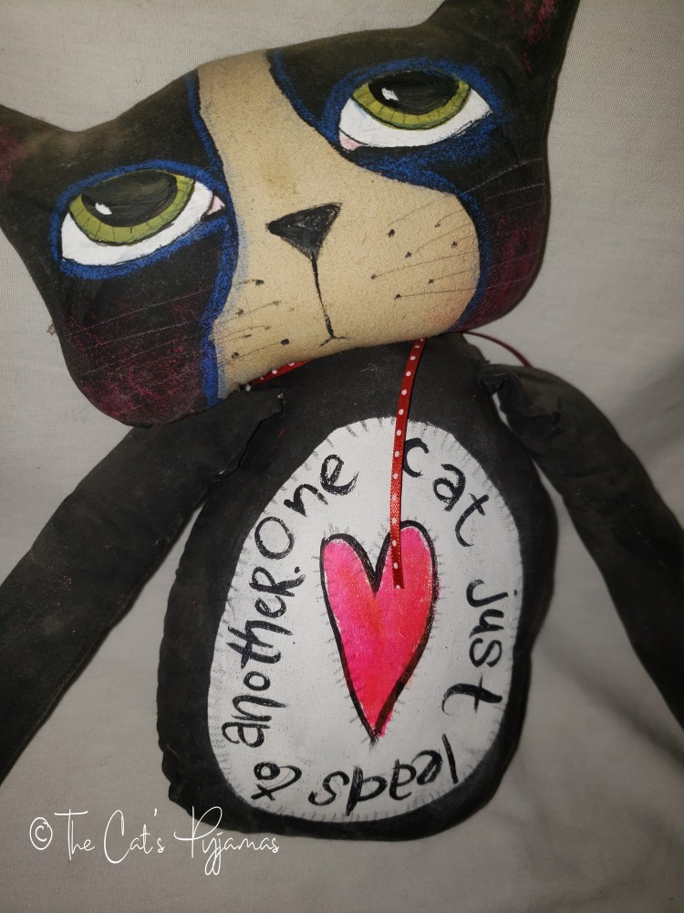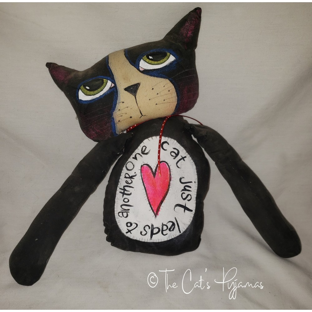 Cat shelf sitter made of painted & stained fabric. Measures 11.5" tall.