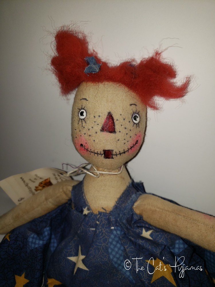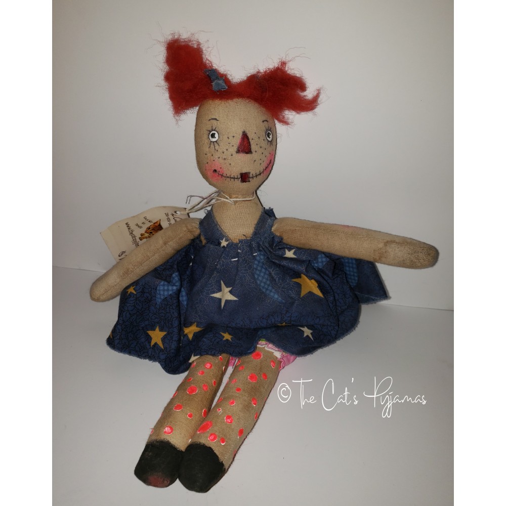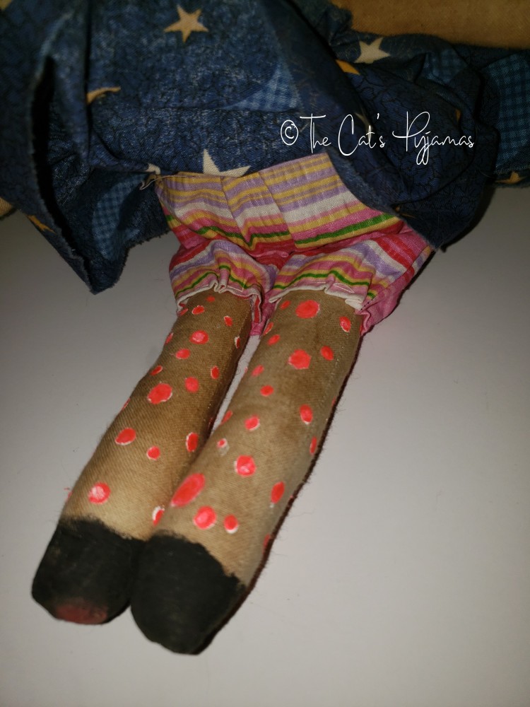Cloth doll with painted face and red wool hair. Her face is painted using a combination of acrylic paint, oil pastels, watercolors, and colored pencil. She's wearing a dark blue dress with moons and stars, colorful bloomers, and her legs are painted with neon red polka dots. She's about 12" tall.