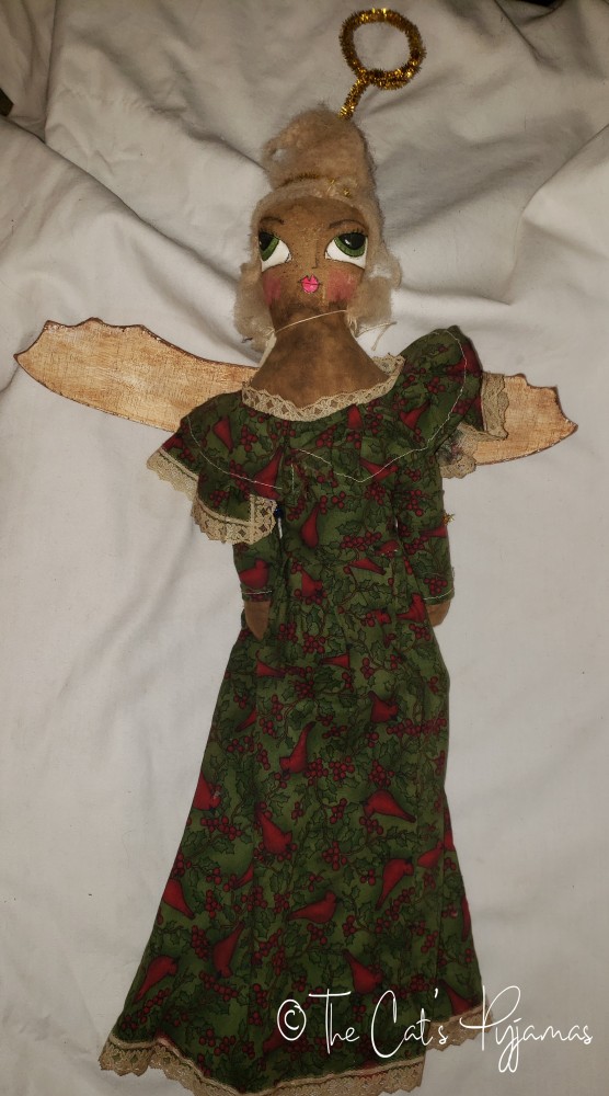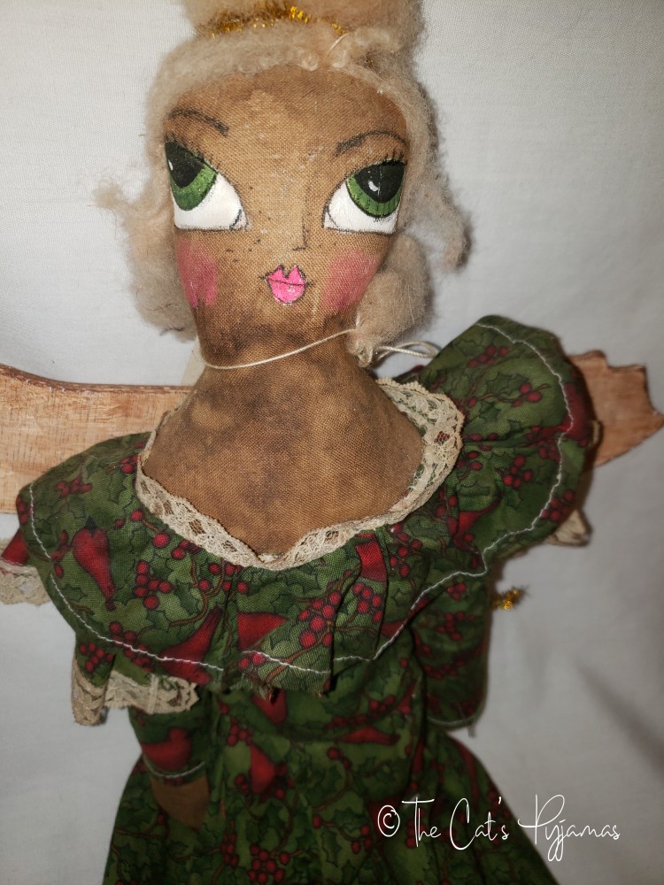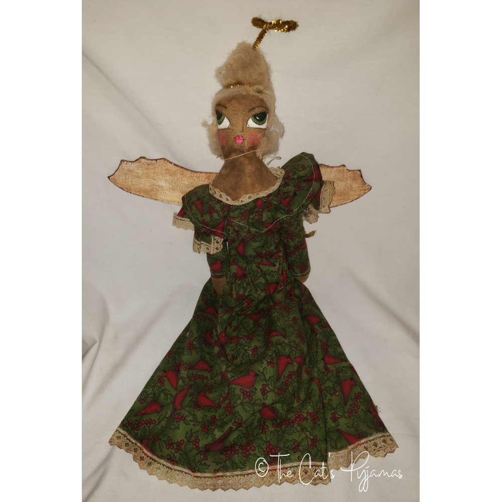 She's made of stained muslin with painted features and wool hair in a big bun. Her wings are made of painted and distressed wood and she's wearing a gold halo. Her dress is green with cardinals and vintage lace trim. She's about 22" tall not including her halo.
