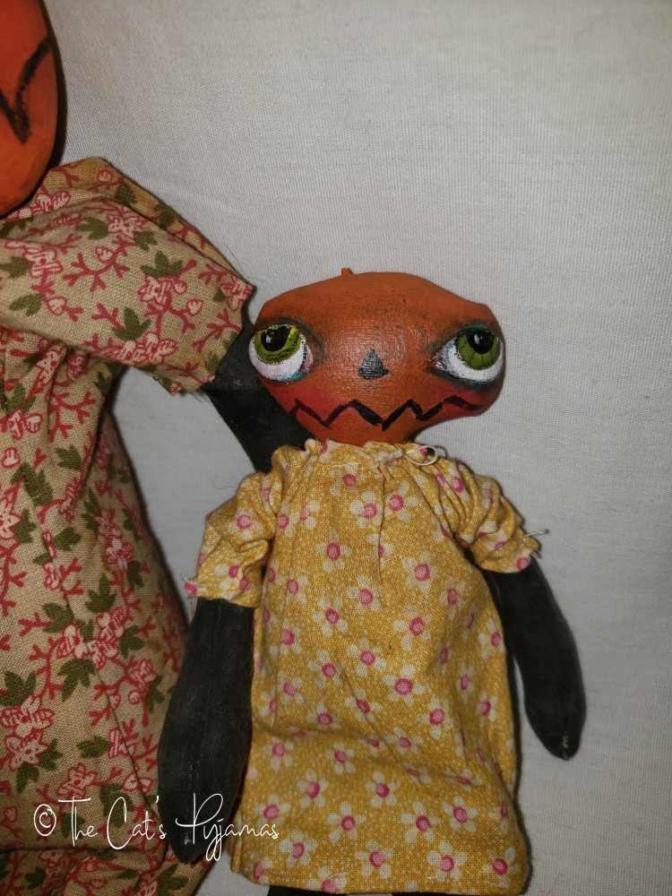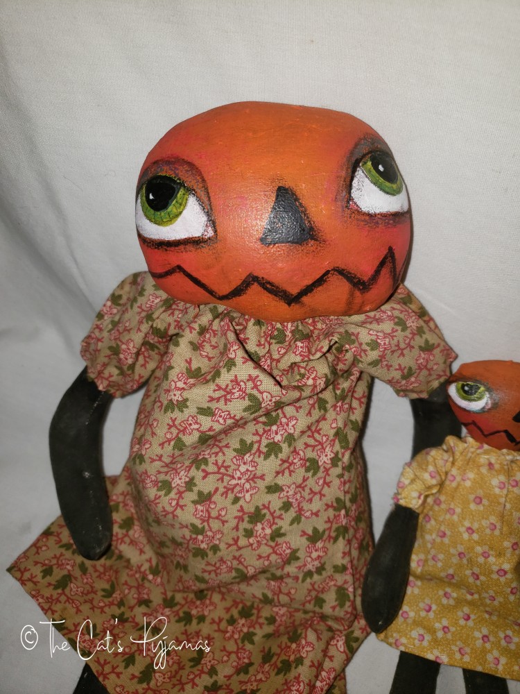 Here are a mama and her baby! Mama is a little over 16" tall and baby is about 7.5" tall. Both are made of painted muslin with floral print dresses.