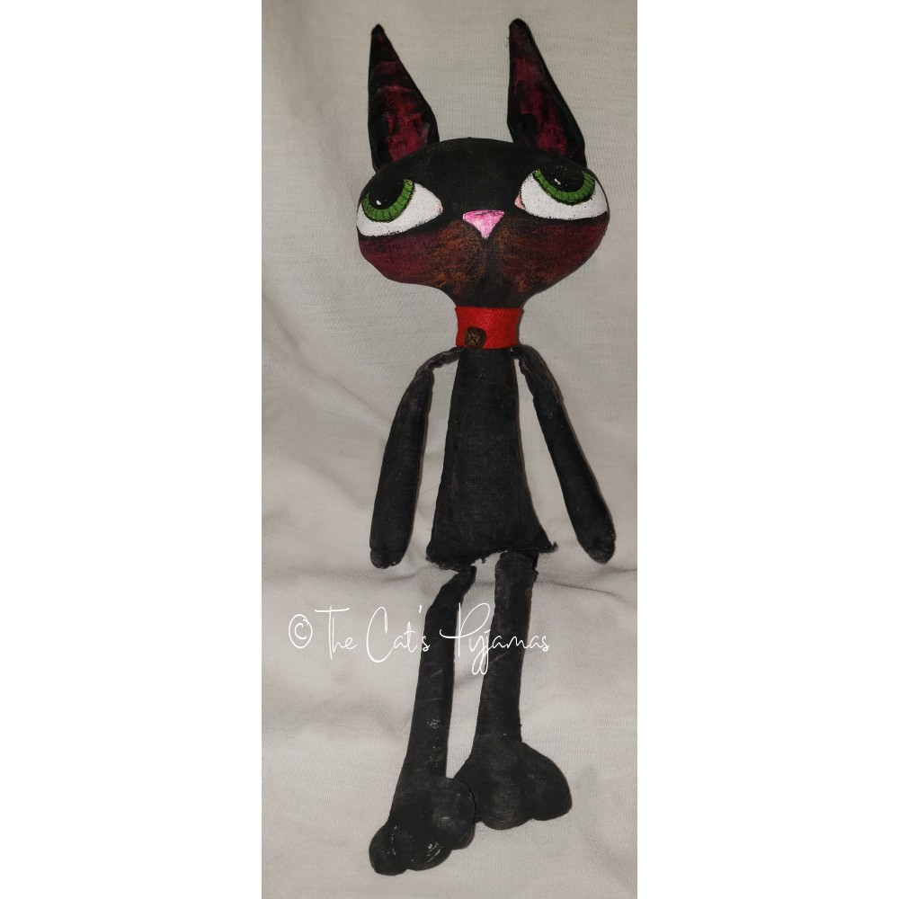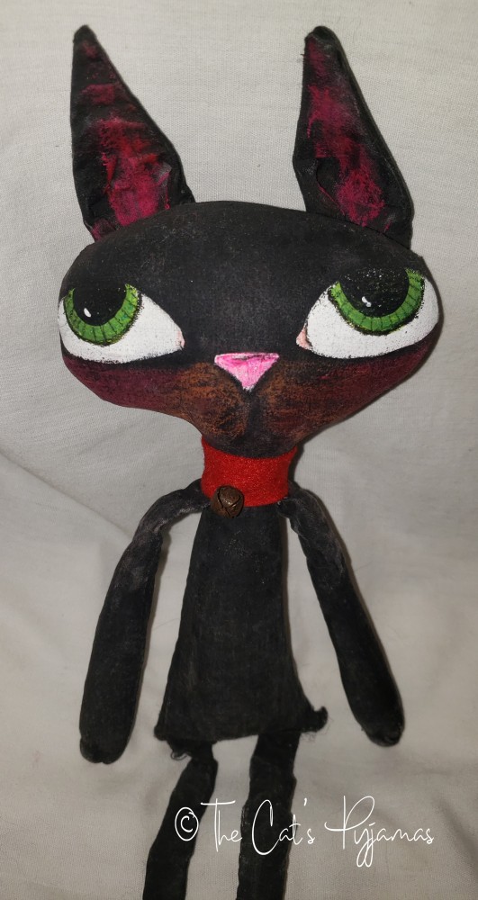 Black cat doll made of painted fabric with big blue eyes, a red felt collar, and a rusty bell. He's about 15.5" tall.