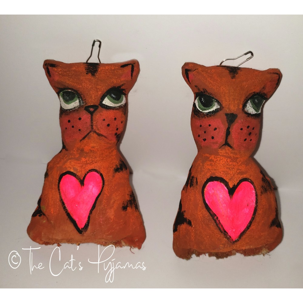 Orange tabby ornaments made of cloth and hand-painted using a combination of acrylic paints, oil pastels, watercolors, and colored pencils. Each one has a neon pink heart and a hanger on top. You can buy one or both! They're about 4.5" tall.