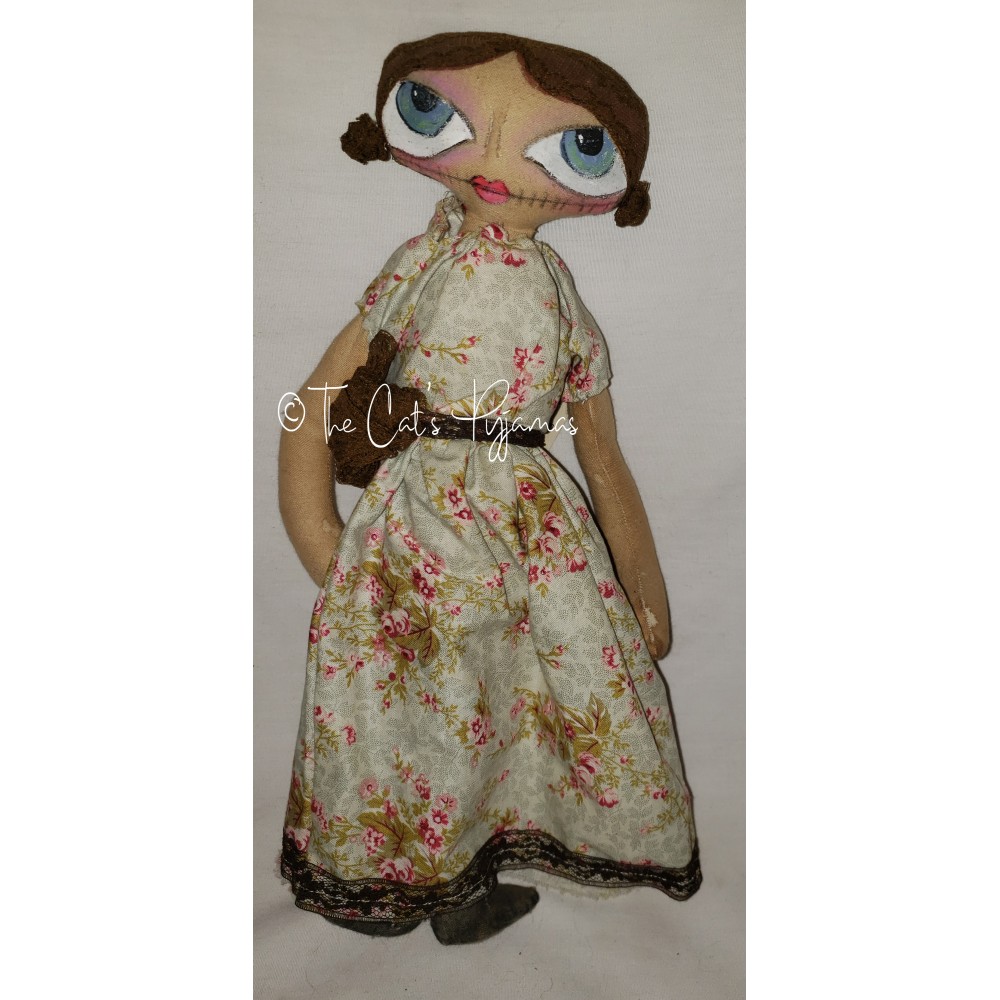 She measures a little over 14" tall, made of stained fabric with painted features! Her hair is made from vintage brown lace and her dress is made of a pretty rose print pattern with the same brown lace trim and belt. She's about 14.5" tall.
