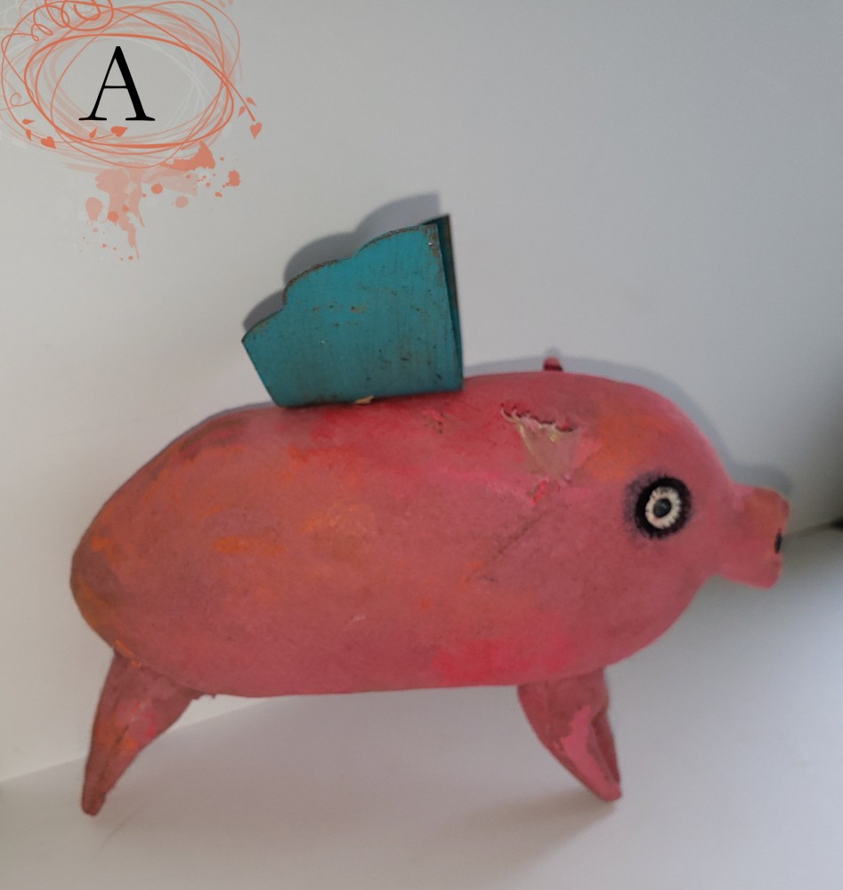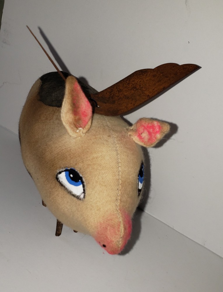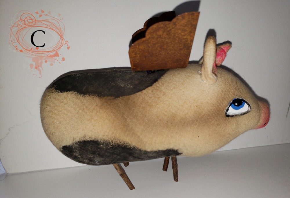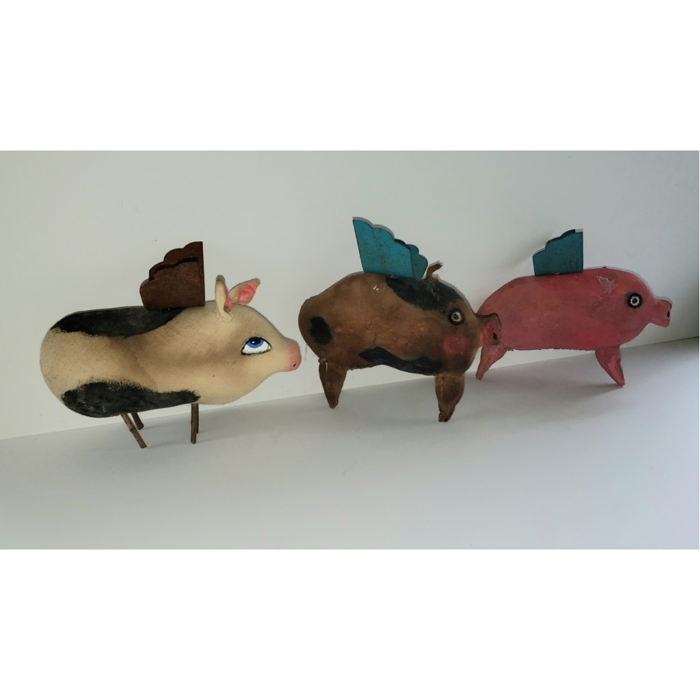 These piggies are made of painted fabric. I used a combination of acrylics, oil pastels, colored pencils and charcoal and gave them metal wings. Pinky and Fifi have fabric legs and Charlotte has stick legs.