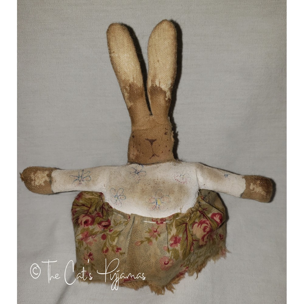 Cute little bunny made of stained and painted fabric and a vintage rose print skirt. Measures a little over 5" tall.