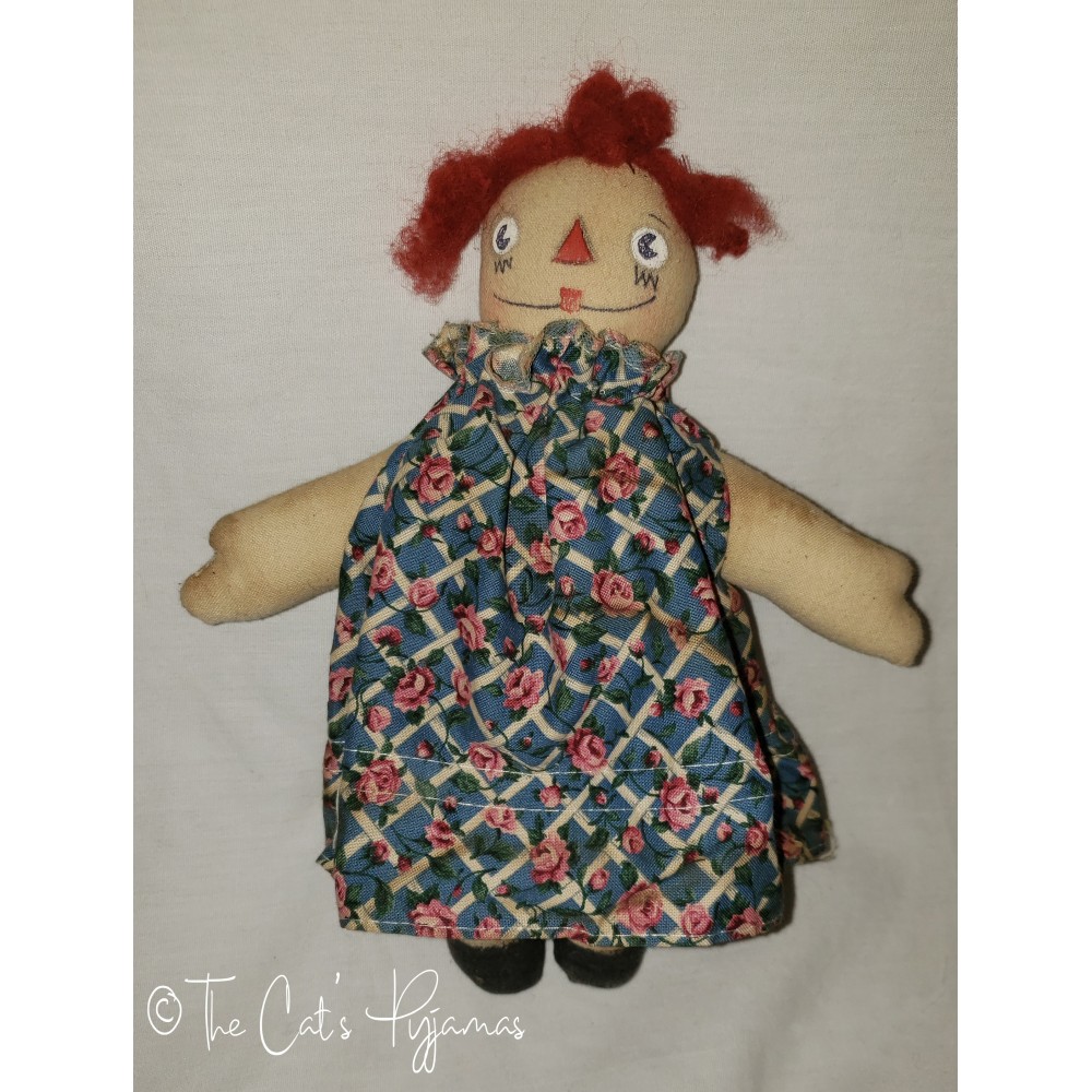 Raggedy Ann style doll made of coffee-stained muslin with hand-painted features. She has dyed red wool for hair, a rose print dress, and is about 9.5" tall.