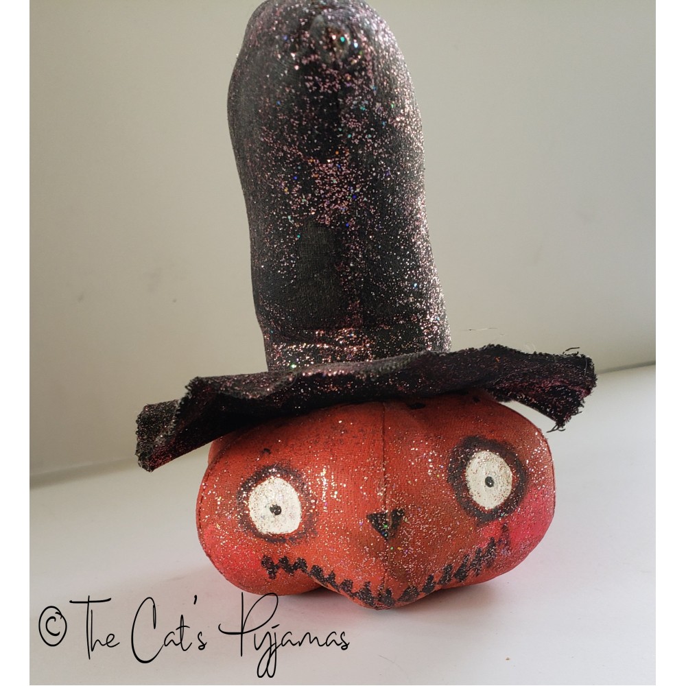 Made of fabric and hand-painted with lots of purple glitter. Measures about 5" tall.