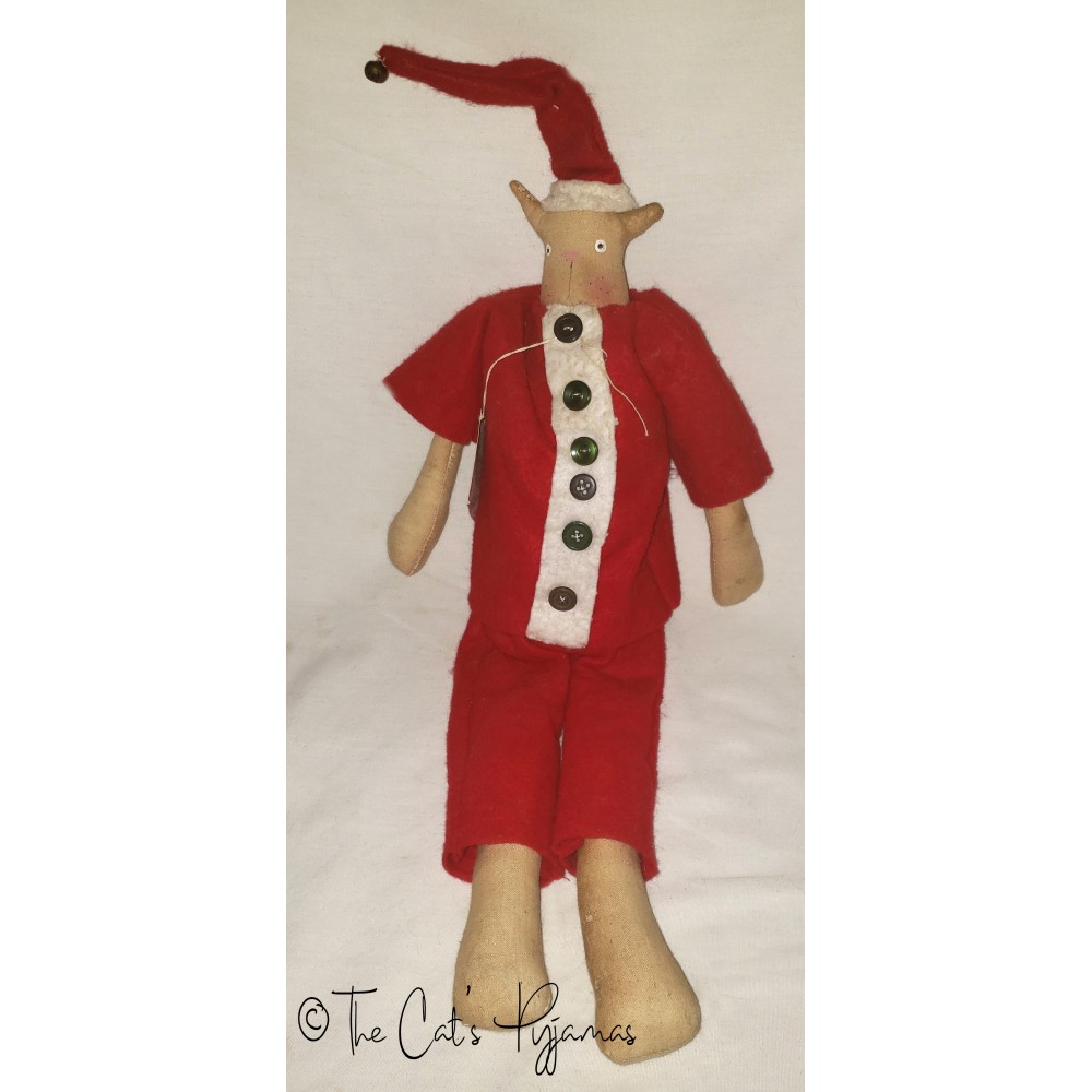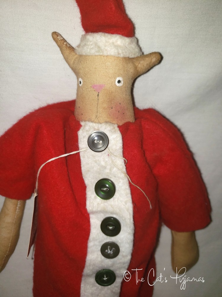 Tall & skinny Santa cat is about 23" tall. He's wearing a classic red and white Santa suit with buttons down the front.
