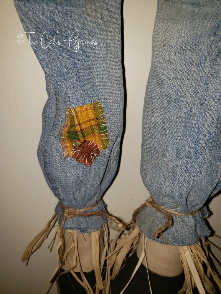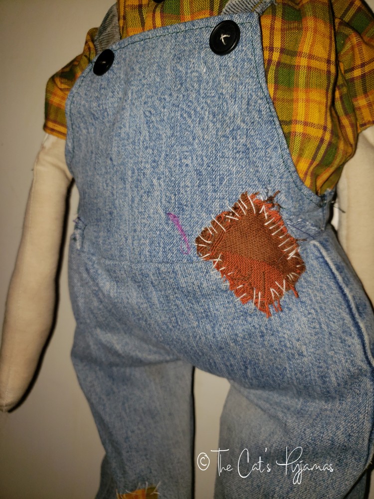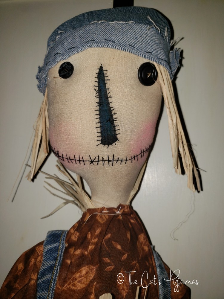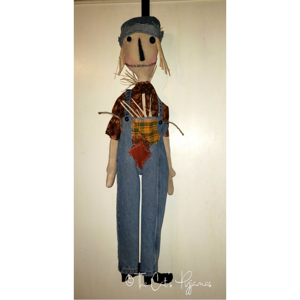 One of a kind scarecrow made of stained muslin with stitched and painted features. He's about 34" tall with button eyes and "straw" hair. His overalls and hat are made of old, worn out jeans with patches on the overalls and his shirt is made of a fall print fabric.