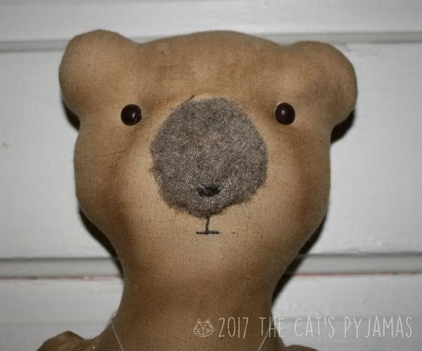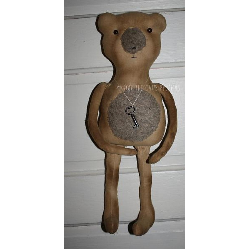 Teddy is made of coffee stained muslin with faux fur muzzle and belly and old shoe buttons for eyes! And he has an old key around his neck....Measures 18" tall. Email me if you want to see more pictures. Based on a pattern from Veena's Mercantile.