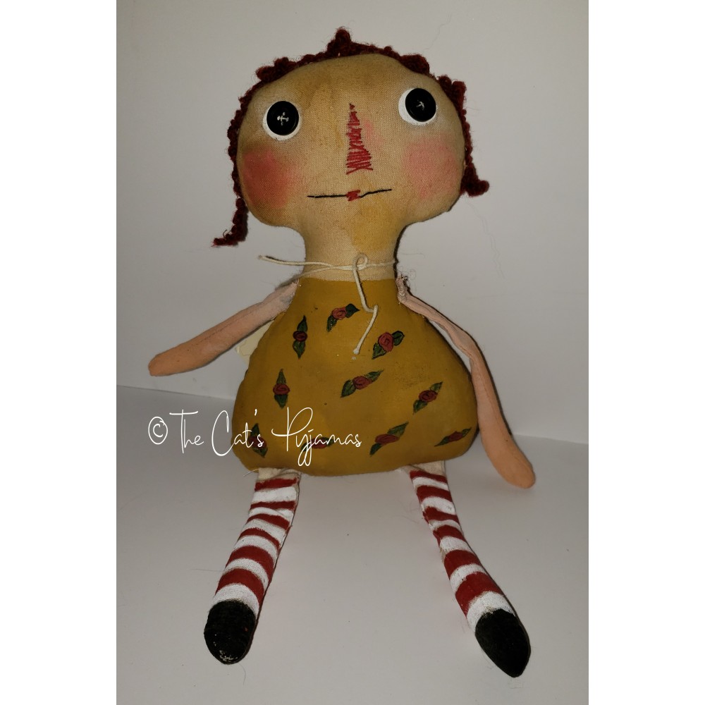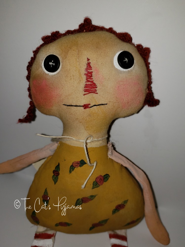 Raggedy Ann doll made with coffee-stained and painted fabric. Her face is hand-stitched with button eyes and she has dyed wool yarn hair. She's about 11.5" tall.