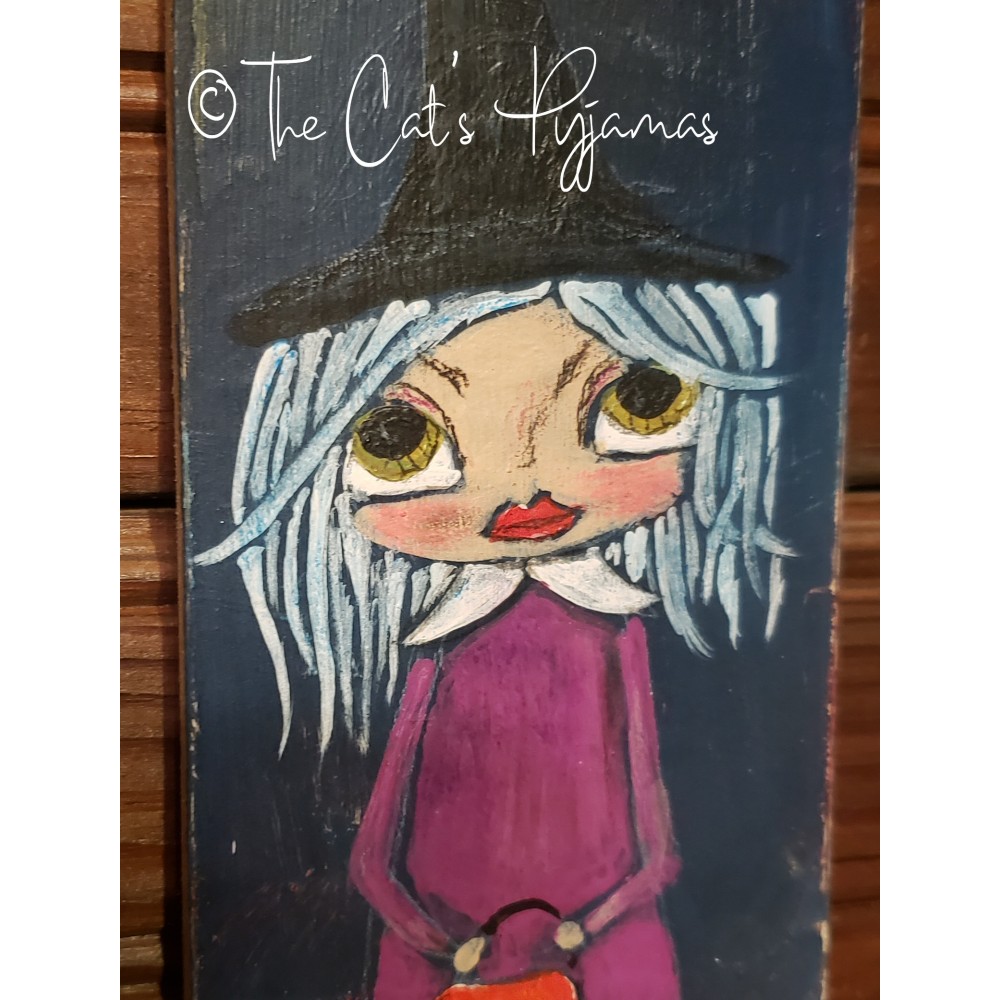 Mixed media art using a combination of acrylics, oil pastels, watercolors, colored pencils, and charcoal. Painted on a wooden sign that measures about 3" x 7".